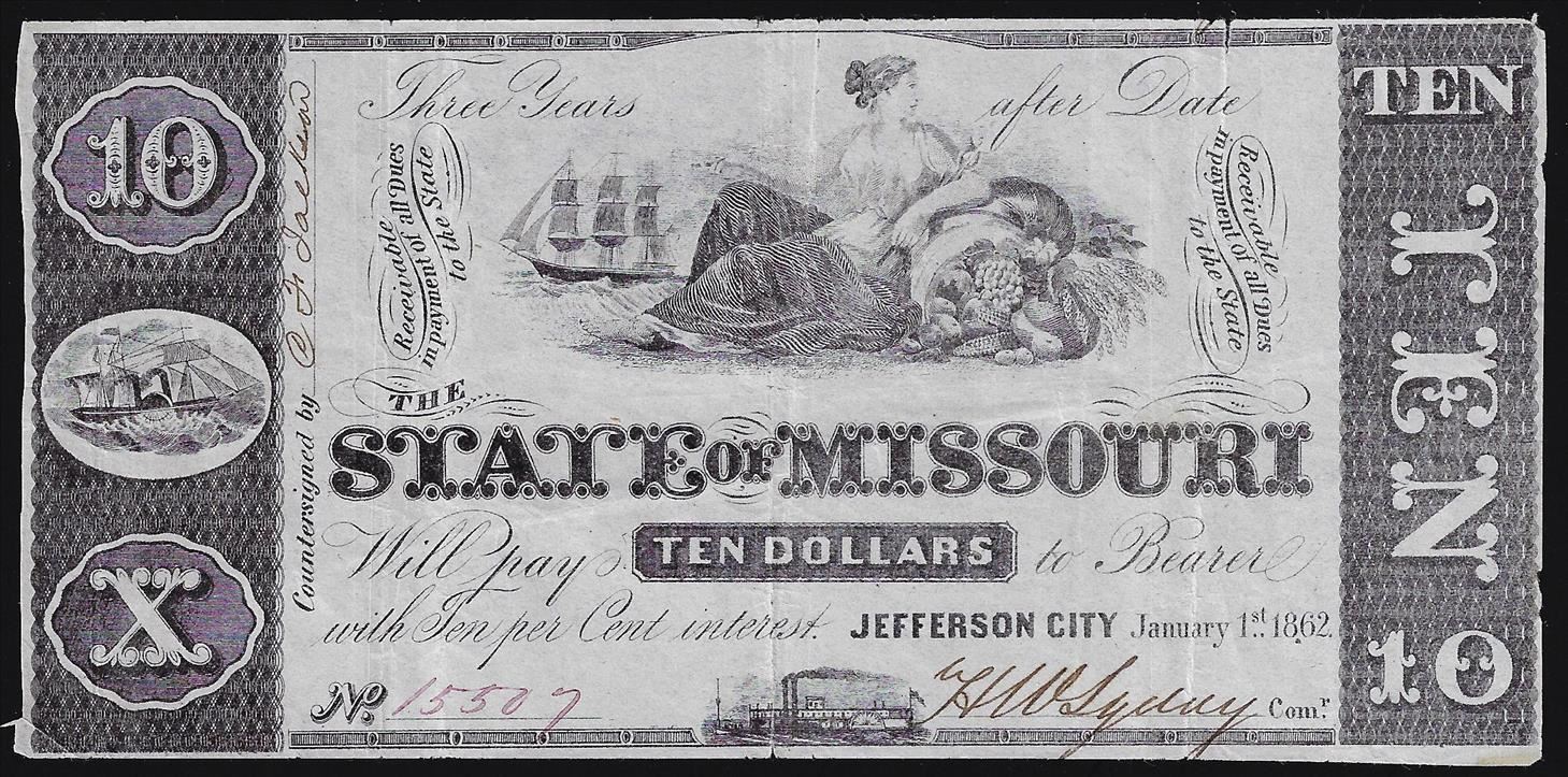 One 1862 $10 The State of Missouri Obsolete Bank Note.