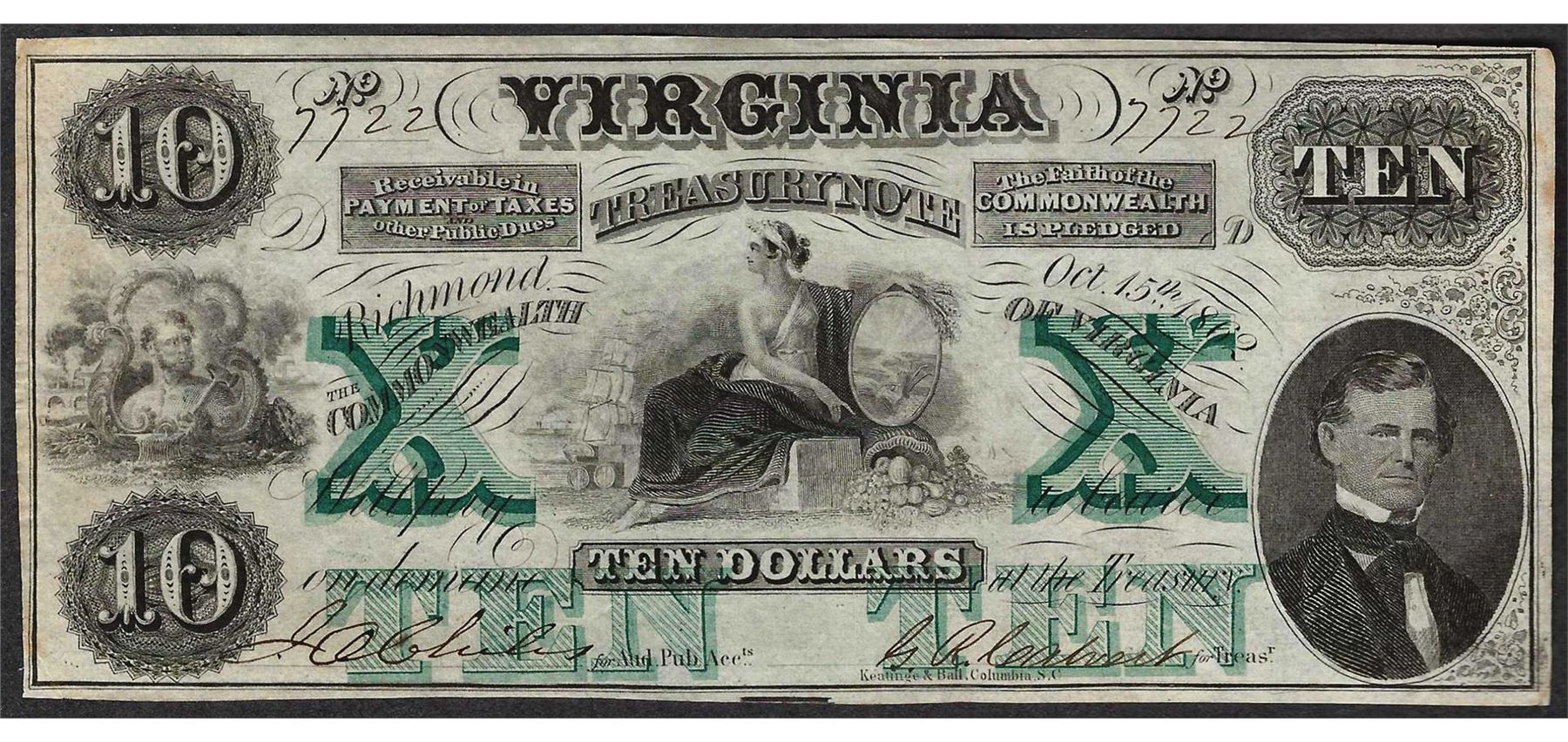 One 1862 $10 The Virginia Treasury Obsolete Note.
