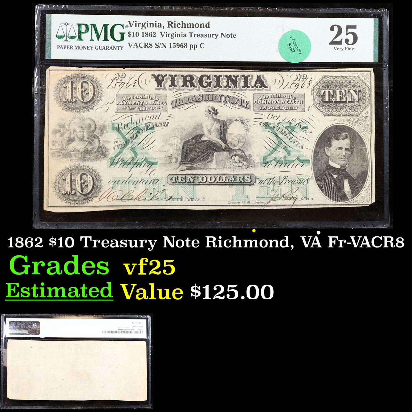 1862 $10 Treasury Note Richmond, VA Fr-VACR8 Graded vf25 By PMG