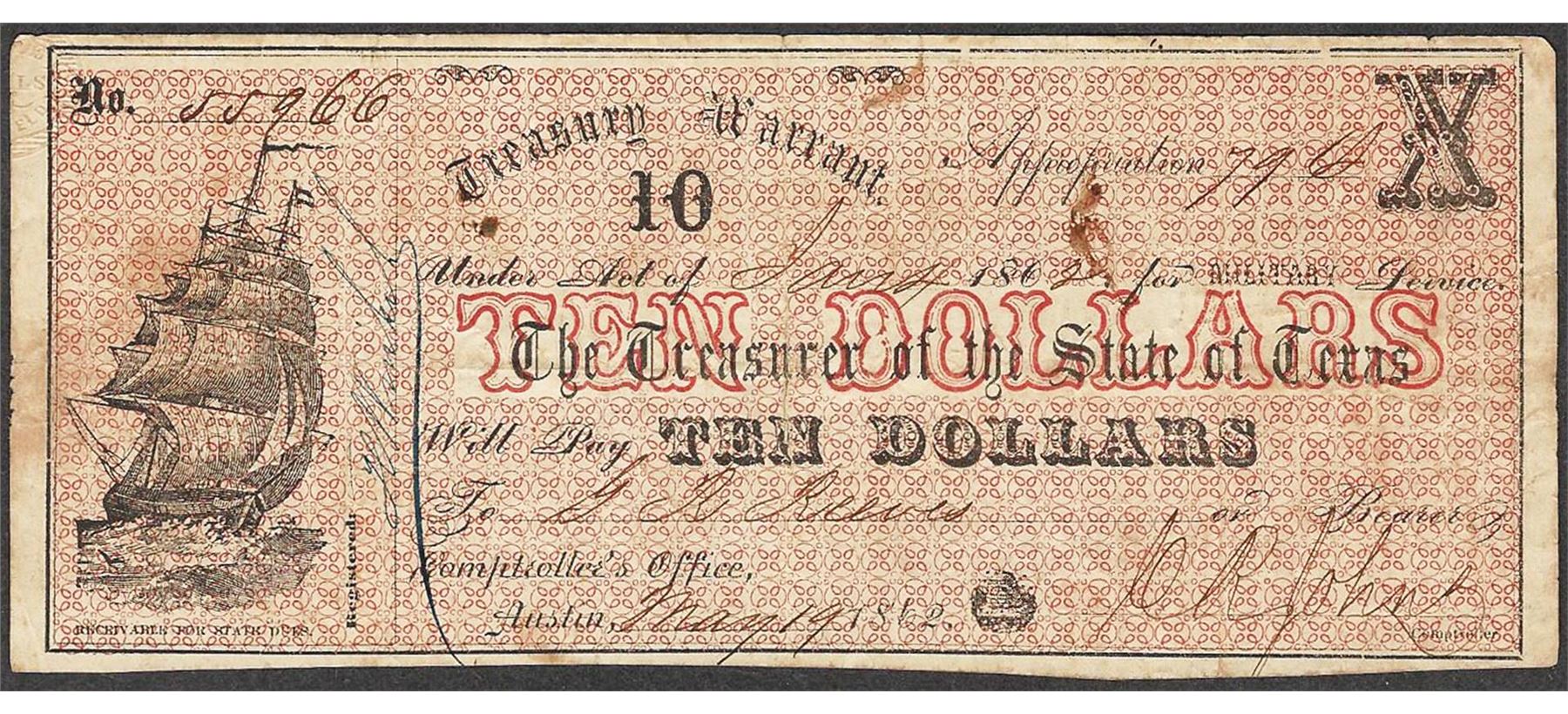 One 1862 $10 Treasury Warrant Obsolete Note.