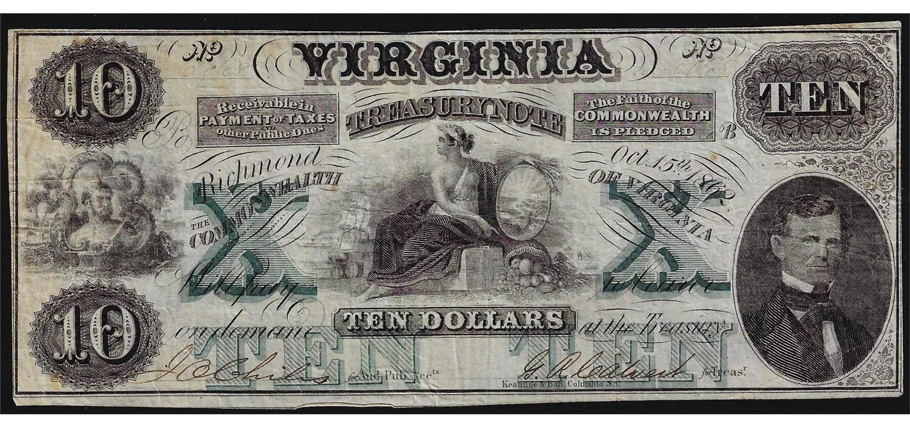 One 1862 $10 Virginia Treasury Note Obsolete Bank Note.