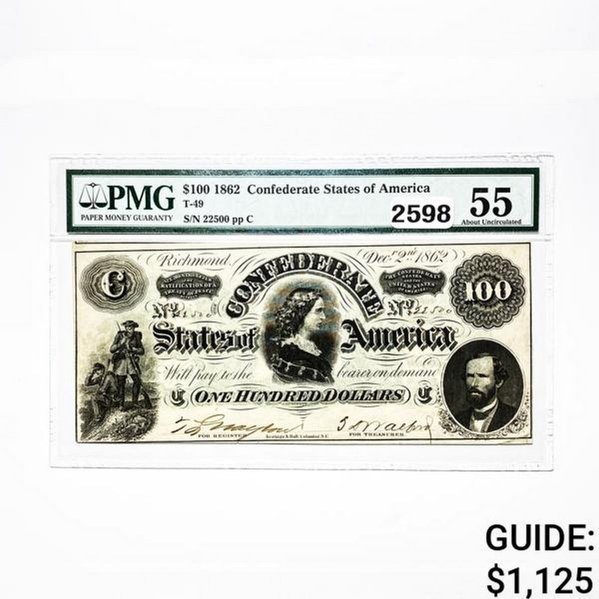 1862 $100 Con. States of America Note PMG 55 UNC