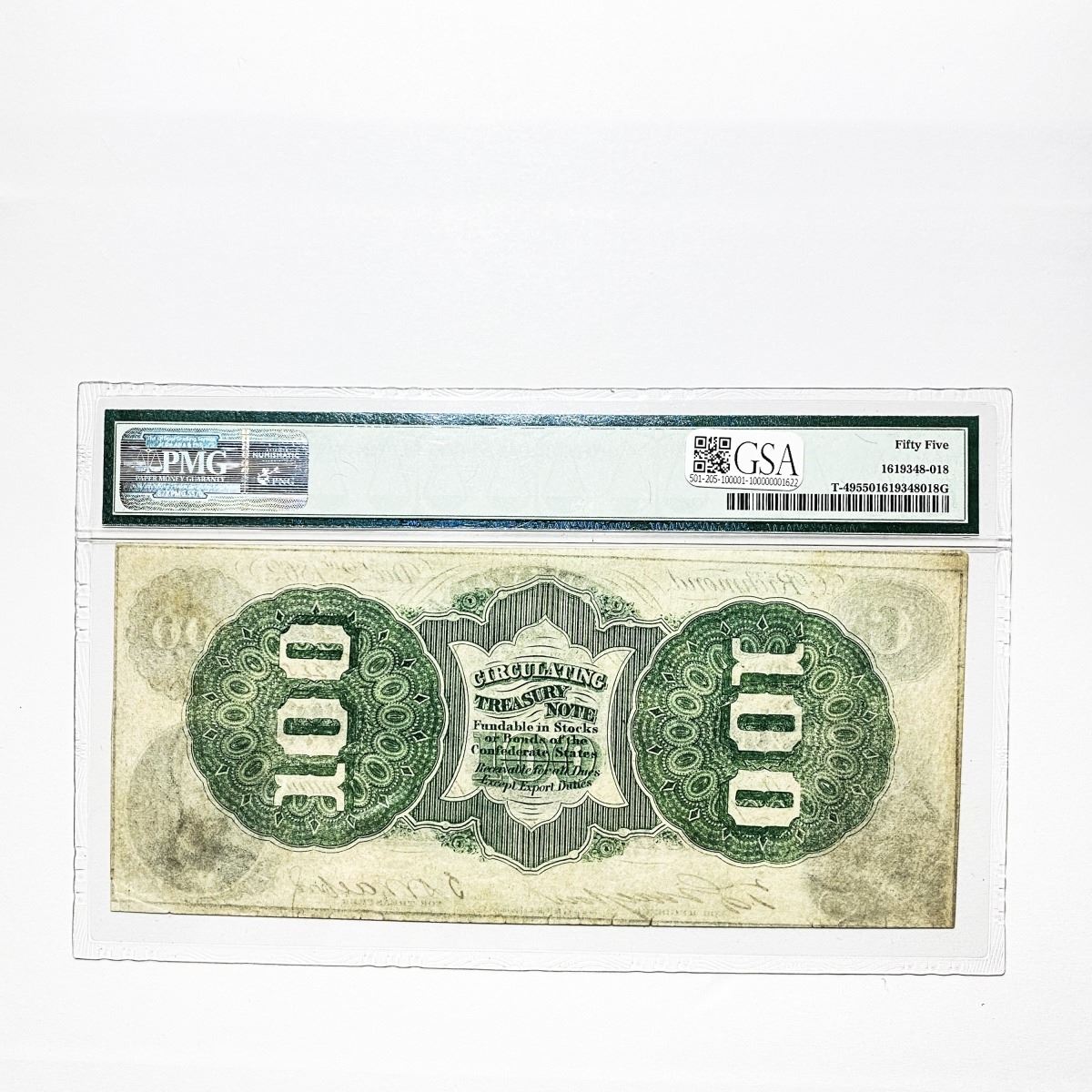 f. Notes sold referencing a third-party grading service are sold “AS IS” without any express or implied warranty, except for guarantee by GSA that they are genuine. Grading, condition or other attributes of any Product may have a material effect on its value and the opinion of others, including third-party grading services such as PCGS Currency and PMG may differ with that of GSA. GSA shall not be bound by any prior or subsequent opinion, determination, or certification by any grading service. Bidders specifically waive any claim to right of return of any Product because of the opinion, determination, or certification, or lack thereof, by any grading service. Certain warranties may be available from the grading services and Bidders are referred to them for further details: Paper Money Guaranty (PMG), PO Box 4711, Sarasota, FL 34230; PCGS Currency, PO Box 10470, Peoria, IL 61612-0470; PCGS Gold Shield, PO Box 9458, Newport Beach, CA 92658. Third-party graded notes are not returnable for any reason whatsoever.