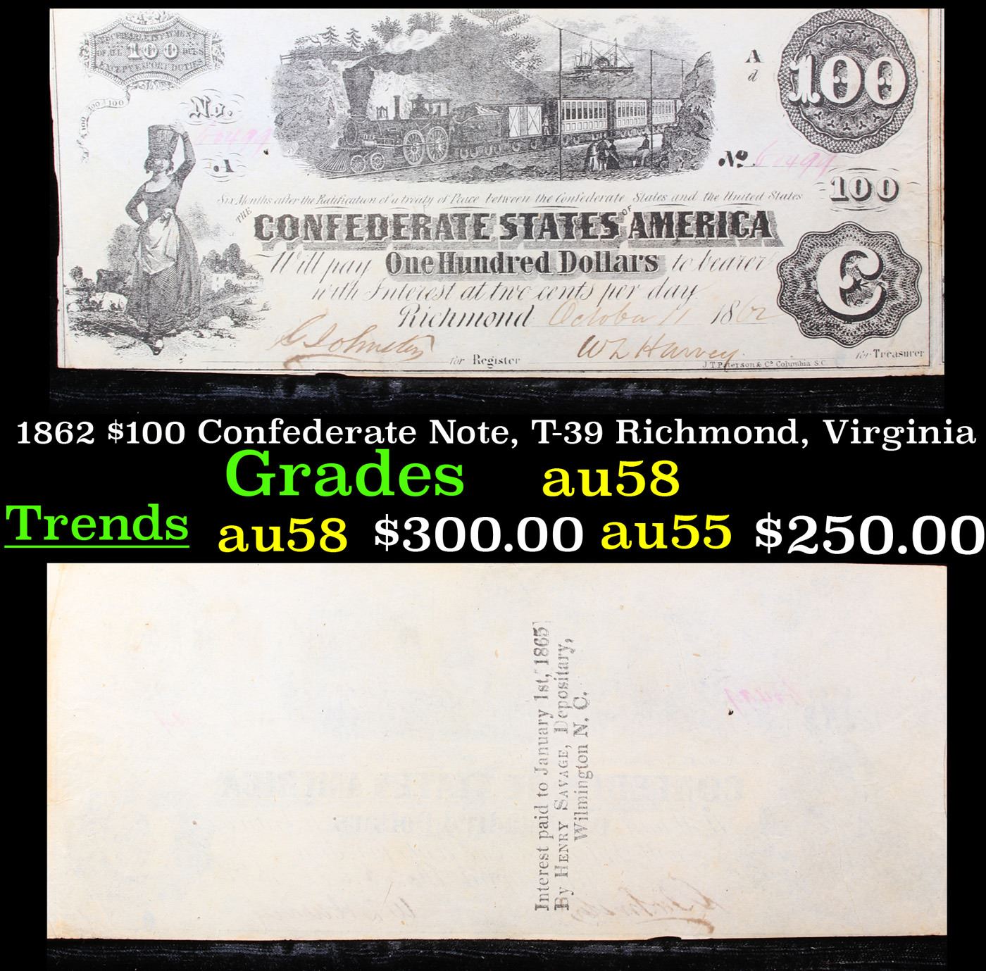 1862 $100 Confederate Note, T-39 Richmond, Virginia Grades Choice AU/BU Slider