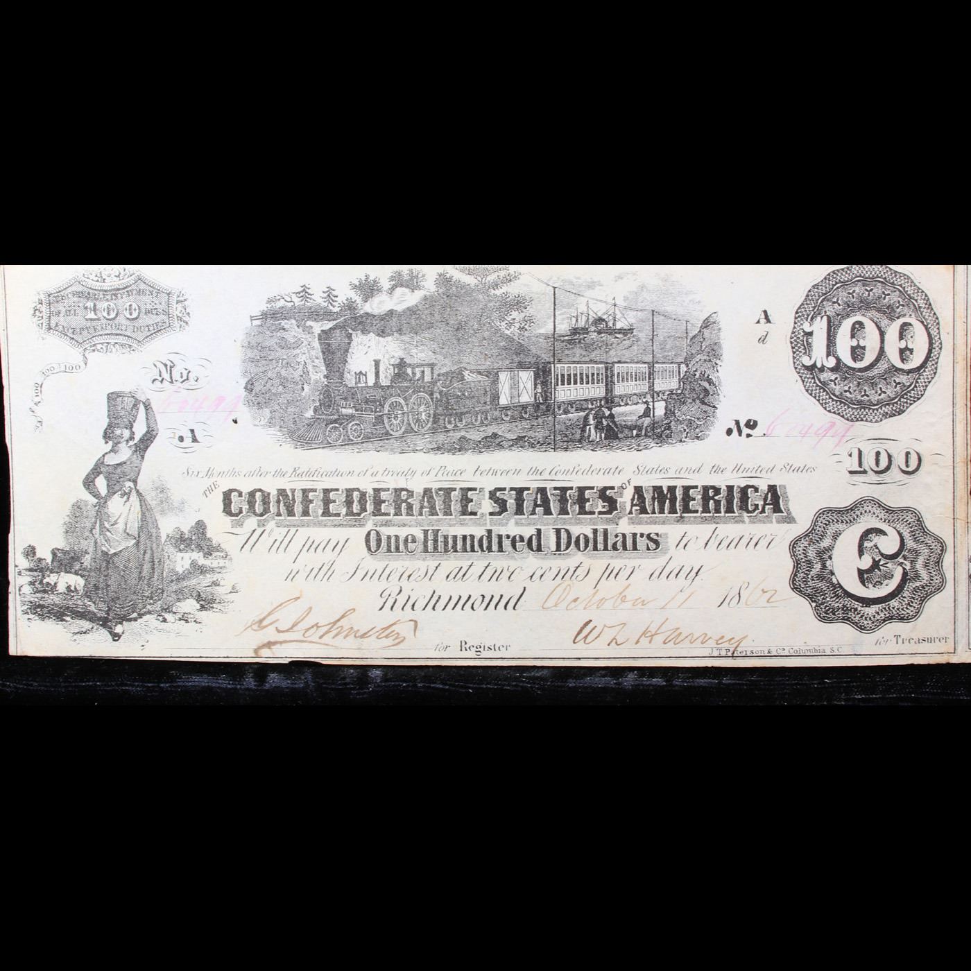 1862 $100 Confederate Note, T-39 Richmond, Virginia Grades Choice AU/BU Slider. High-denomination $100 Confederate Notes are in great demand among collectors and history buffs alike. Carefully preserved for over 155 years since the Civil War. This was the first interest bearing $100 note to be issued in large quantities by the Confederacy. They paid a 7.3% annual interest rate; double that of the First Series notes of Montgomery and Richmond. Some were issued by agents by hand, and their signatures—and sometimes the place of issue—are written on the backs. Some T-39s also have interest paid stamps on the backs indicating that the interest was collected by the bearer. The notes have a popular “Train” vignette on the front, with easily visible “straight steam” (all white) coming out of the smokestack. To the left is a vignette of a milkmaid. Once thought to be an apple, the object in her left hand above her head is most likely the handle of the bucket on her head. These notes were payable six months after the ratification of a Treaty of Peace between the Confederate States and United States and were not fundable.