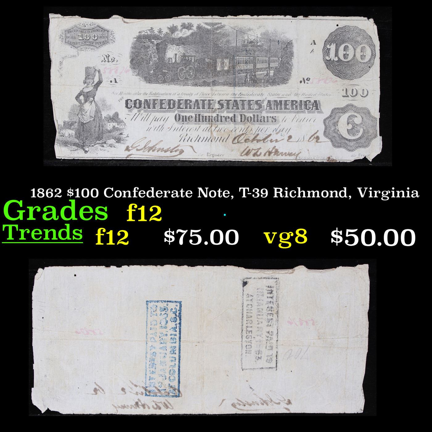 1862 $100 Confederate Note, T-39 Richmond, Virginia Grades f, fine. High-denomination $100 Confederate Notes are in great demand among collectors and history buffs alike. Carefully preserved for over 155 years since the Civil War. This was the first interest bearing $100 note to be issued in large quantities by the Confederacy. They paid a 7.3% annual interest rate; double that of the First Series notes of Montgomery and Richmond. Some were issued by agents by hand, and their signatures—and sometimes the place of issue—are written on the backs. Some T-39s also have interest paid stamps on the backs indicating that the interest was collected by the bearer. The notes have a popular “Train” vignette on the front, with easily visible “straight steam” (all white) coming out of the smokestack. To the left is a vignette of a milkmaid. Once thought to be an apple, the object in her left hand above her head is most likely the handle of the bucket on her head. These notes were payable six months after the ratification of a Treaty of Peace between the Confederate States and United States and were not fundable.