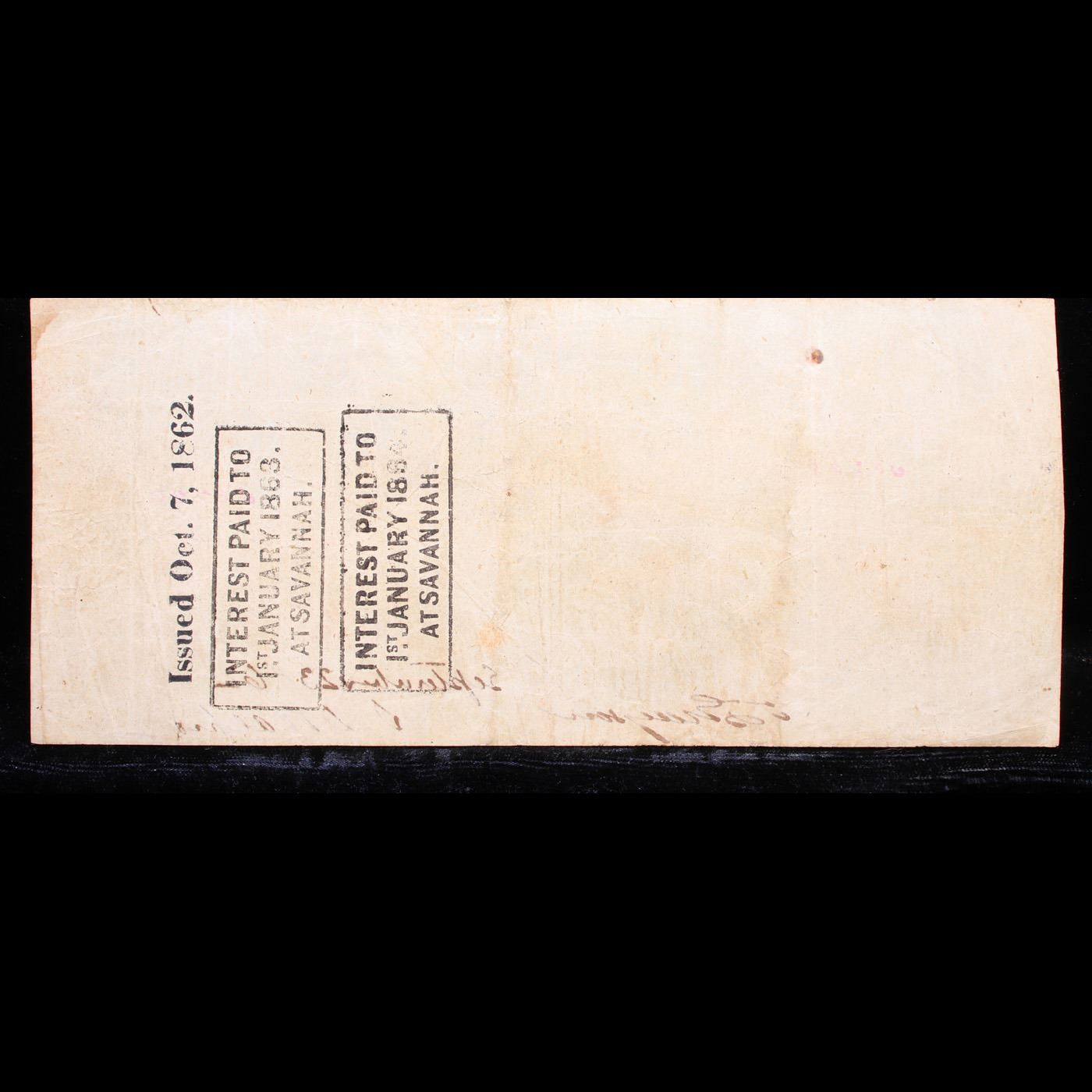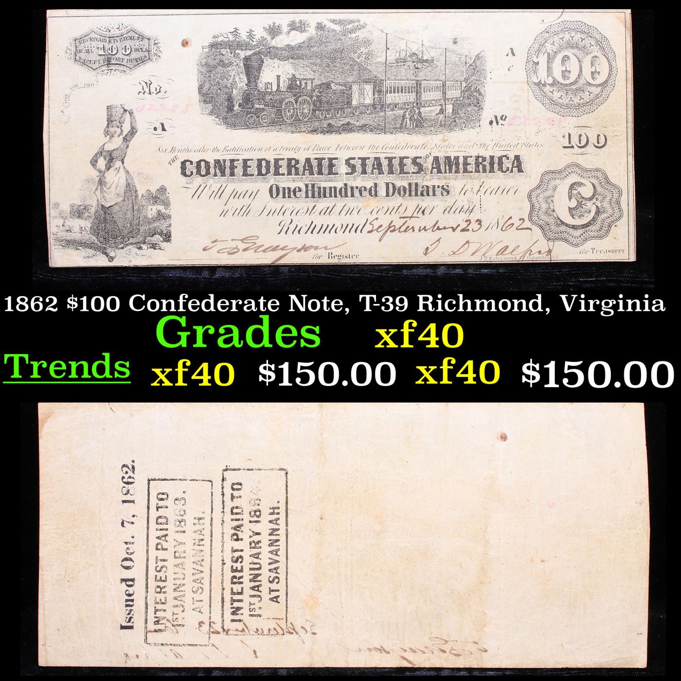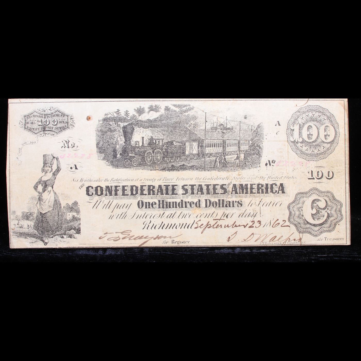 1862 $100 Confederate Note, T-39 Richmond, Virginia Grades xf. High-denomination $100 Confederate Notes are in great demand among collectors and history buffs alike. Carefully preserved for over 155 years since the Civil War. This was the first interest bearing $100 note to be issued in large quantities by the Confederacy. They paid a 7.3% annual interest rate; double that of the First Series notes of Montgomery and Richmond. Some were issued by agents by hand, and their signatures—and sometimes the place of issue—are written on the backs. Some T-39s also have interest paid stamps on the backs indicating that the interest was collected by the bearer. The notes have a popular “Train” vignette on the front, with easily visible “straight steam” (all white) coming out of the smokestack. To the left is a vignette of a milkmaid. Once thought to be an apple, the object in her left hand above her head is most likely the handle of the bucket on her head. These notes were payable six months after the ratification of a Treaty of Peace between the Confederate States and United States and were not fundable.