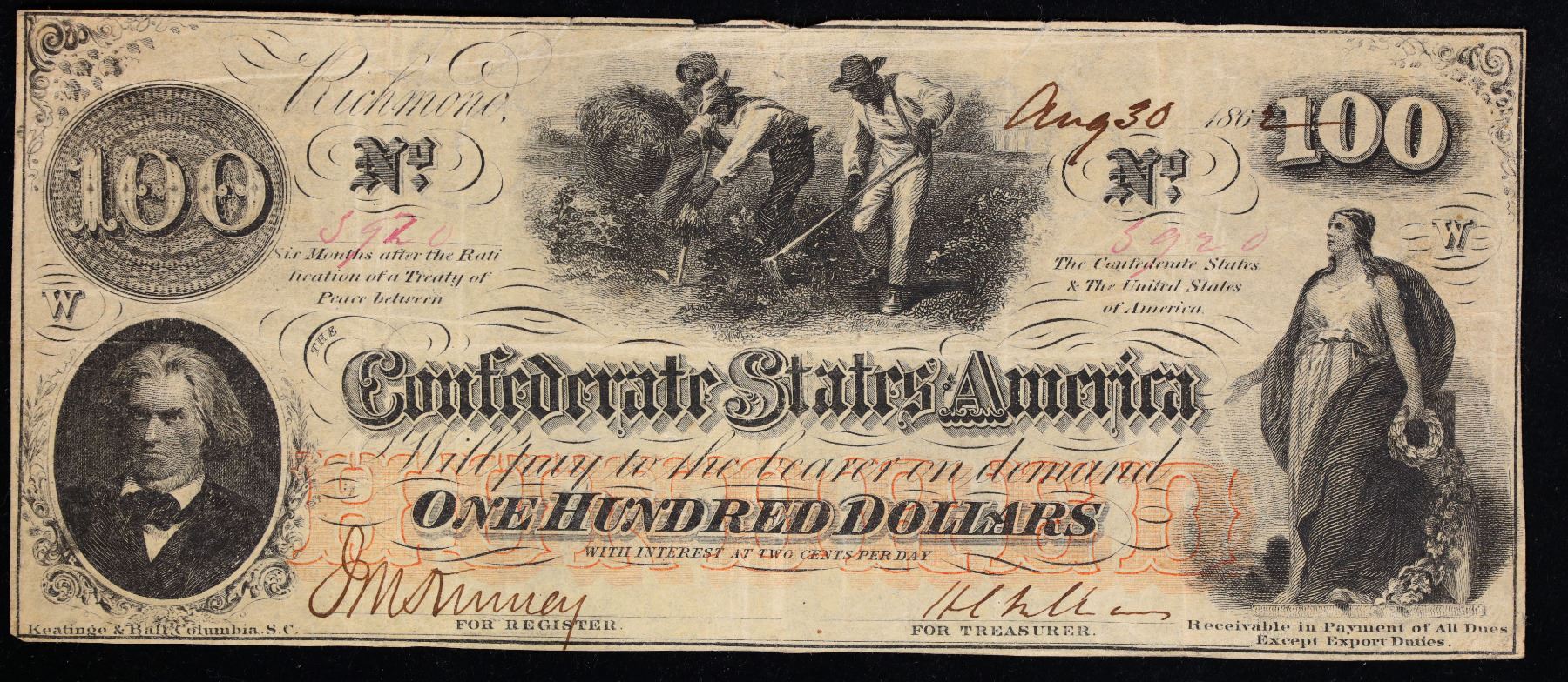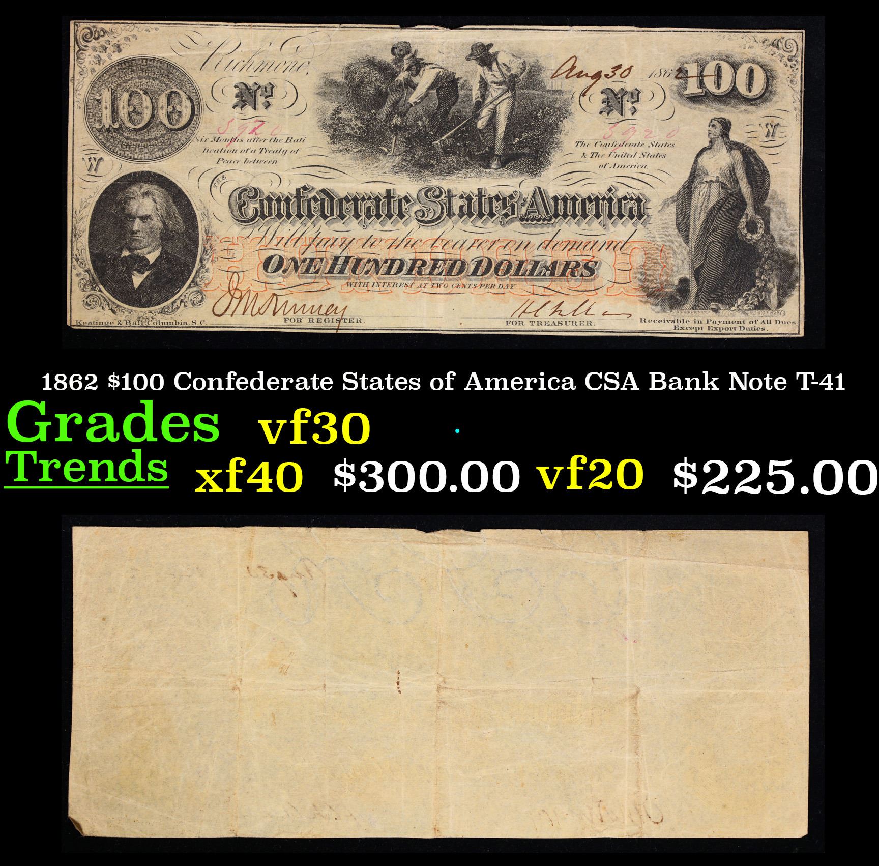 1862 $100 Confederate States of America CSA Bank Note T-41 Grades vf++.