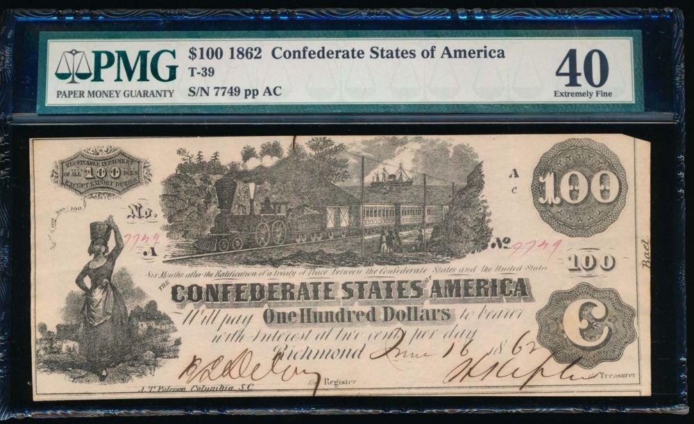 One 1862 $100 Confederate States of America Note PMG 40.
