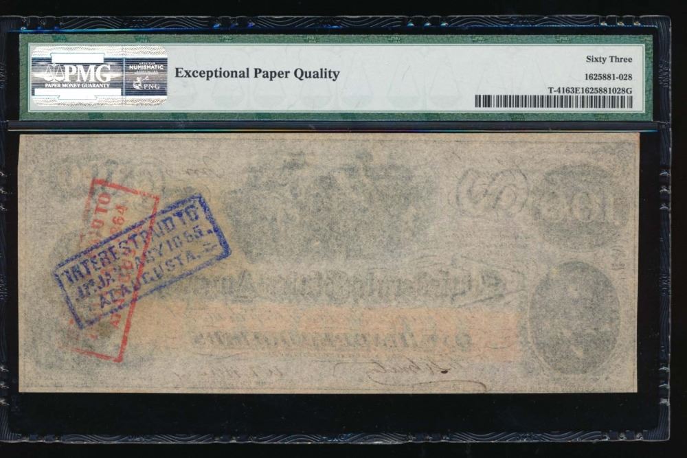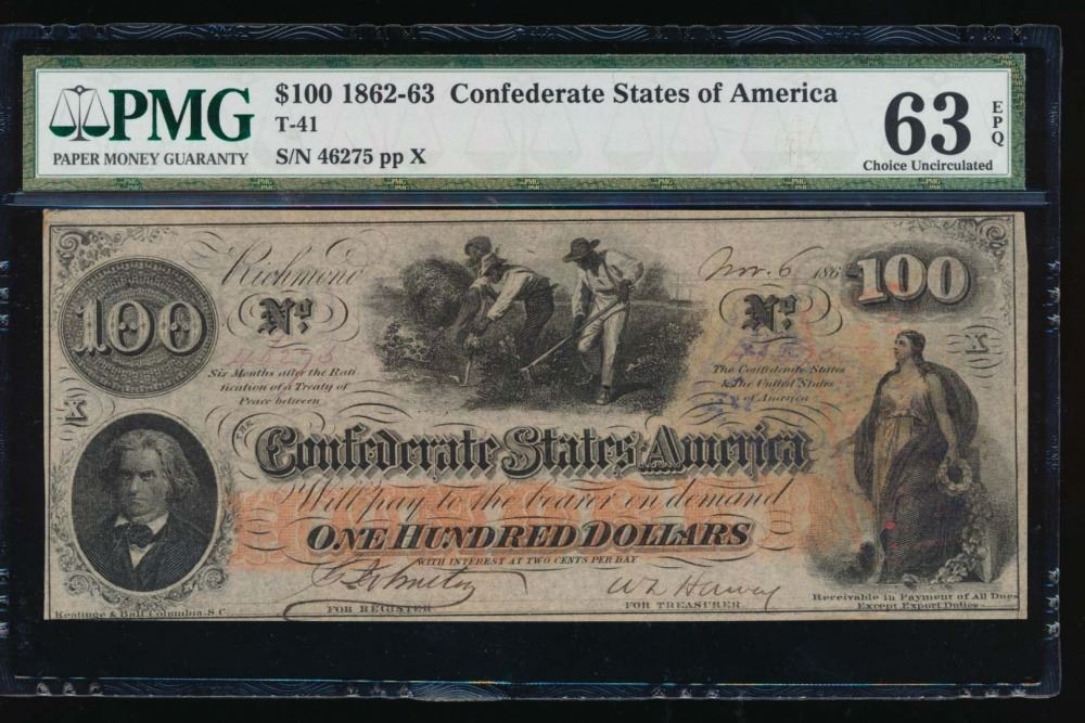 One 1862 $100 Confederate States of America Note PMG 63EPQ.