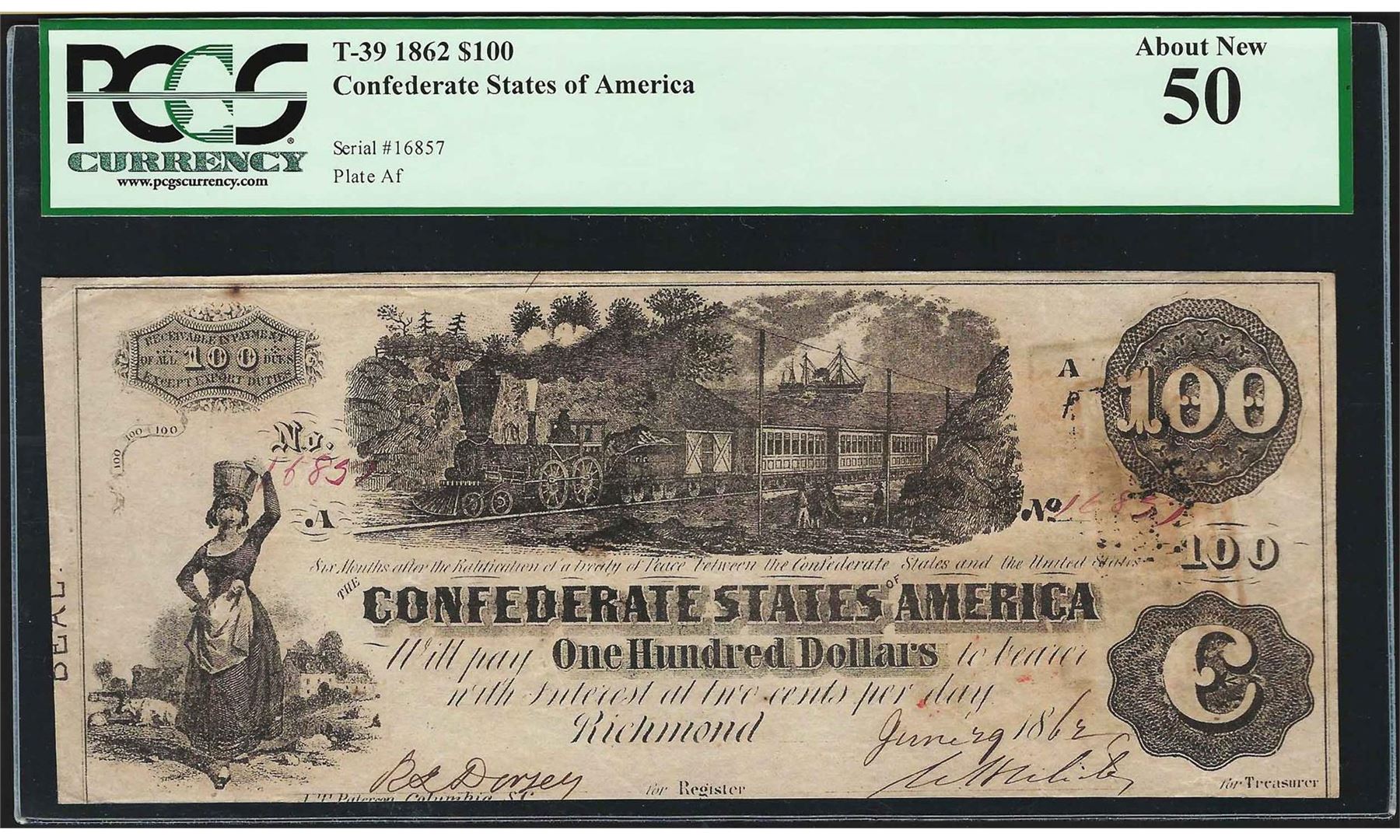 1862 $100 Confederate States of America Note T-39 PCGS About New 50