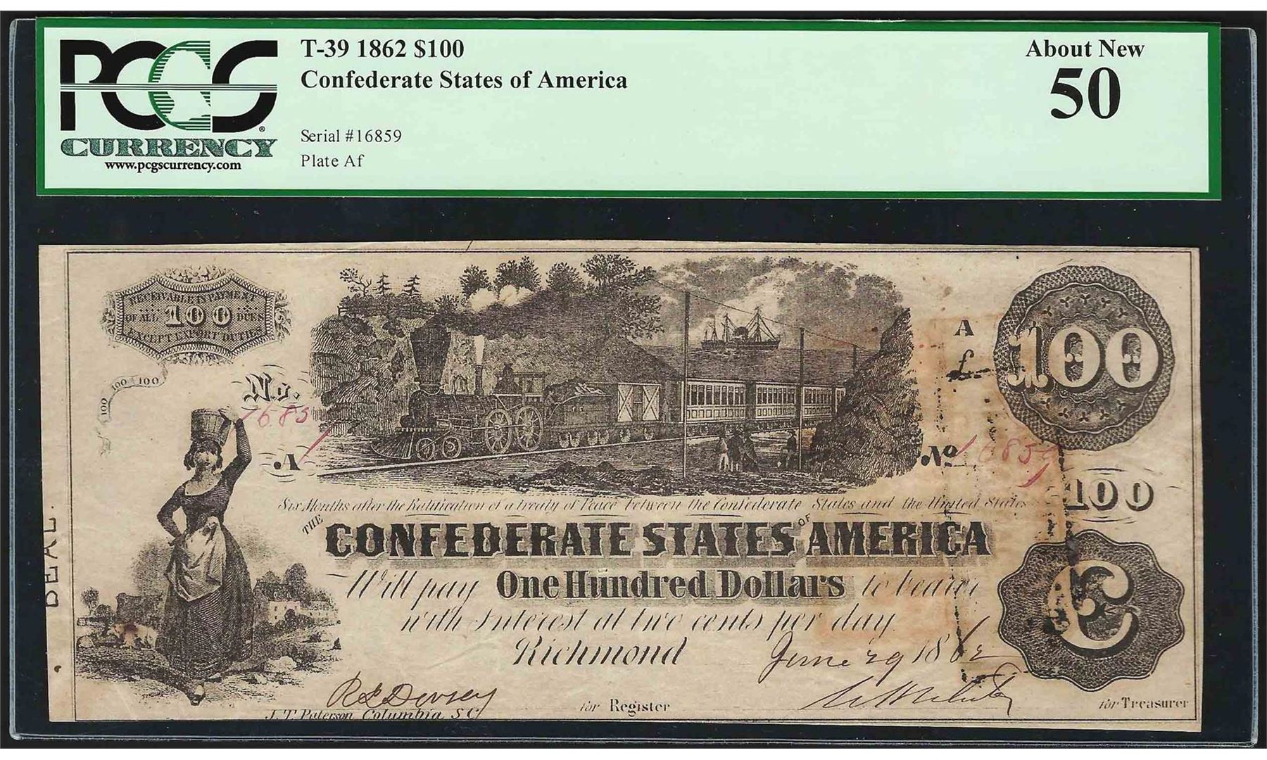 1862 $100 Confederate States of America Note T-39 PCGS About New 50
