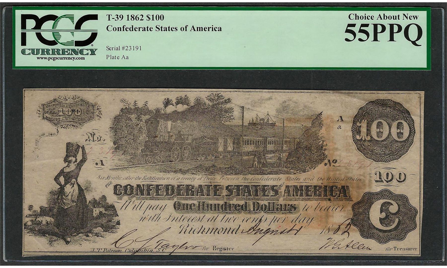 1862 $100 Confederate States of America Note T-39 PCGS About New 55PPQ