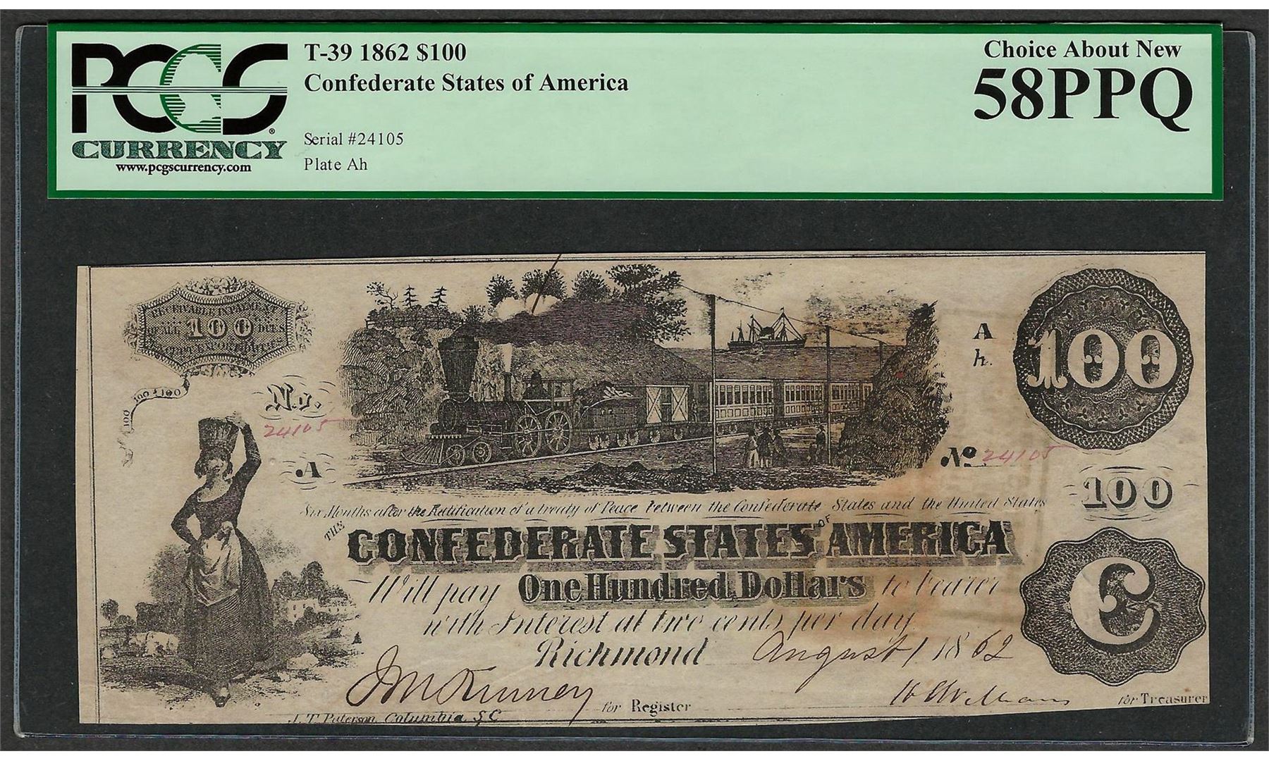 1862 $100 Confederate States of America Note T-39 PCGS About New 58PPQ