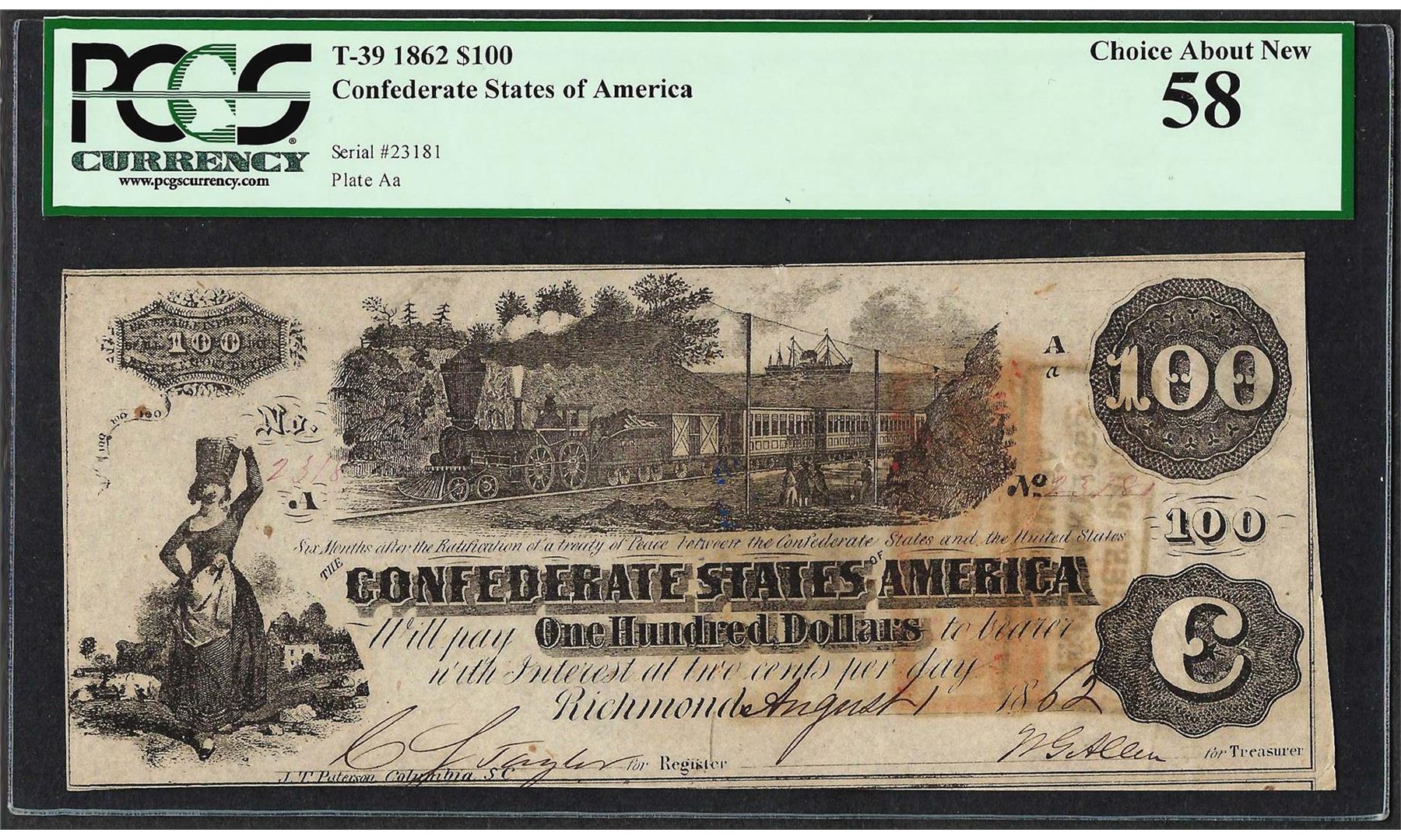 1862 $100 Confederate States of America Note T-39 PCGS Choice About New 58