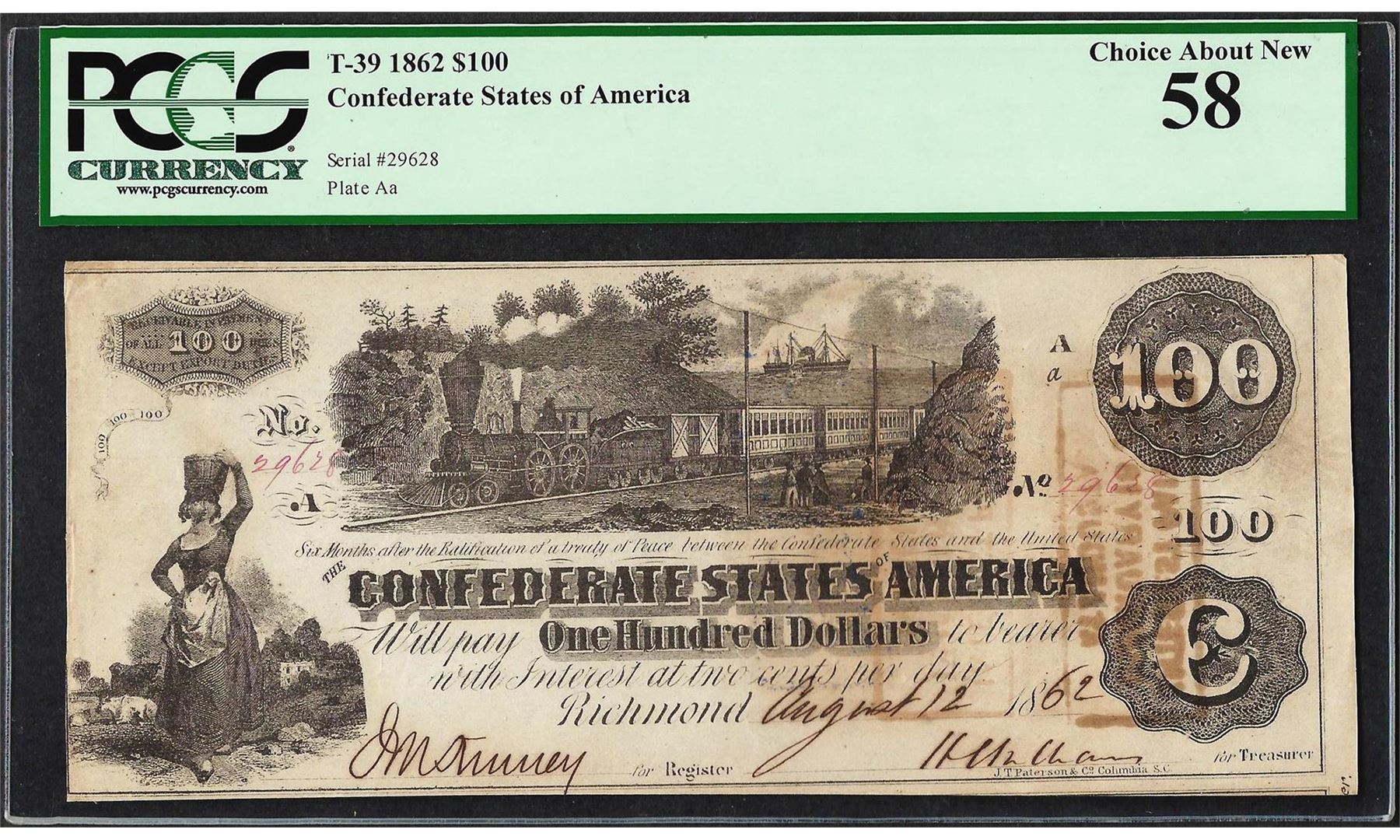 1862 $100 Confederate States of America Note T-39 PCGS Choice About New 58