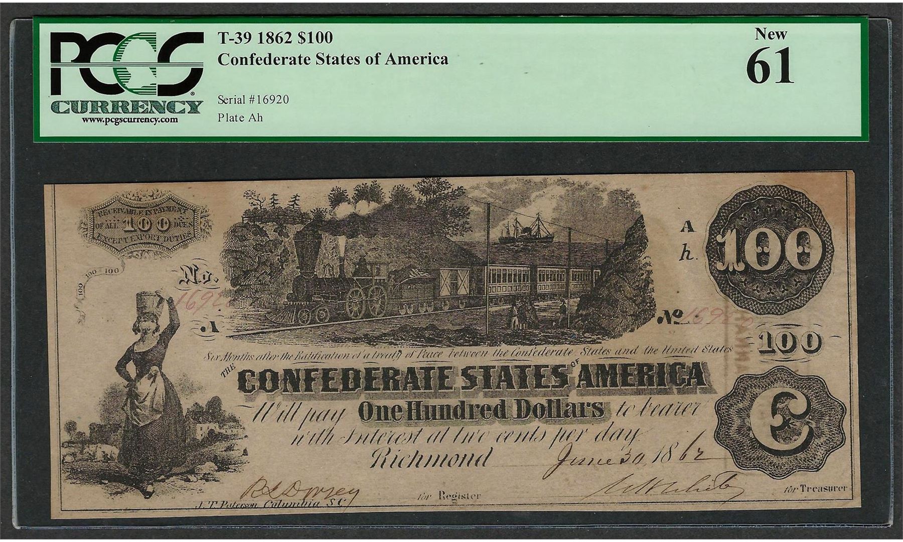 One 1862 $100 Confederate States of America Note T-39 PCGS New 61. PCGS Graded.