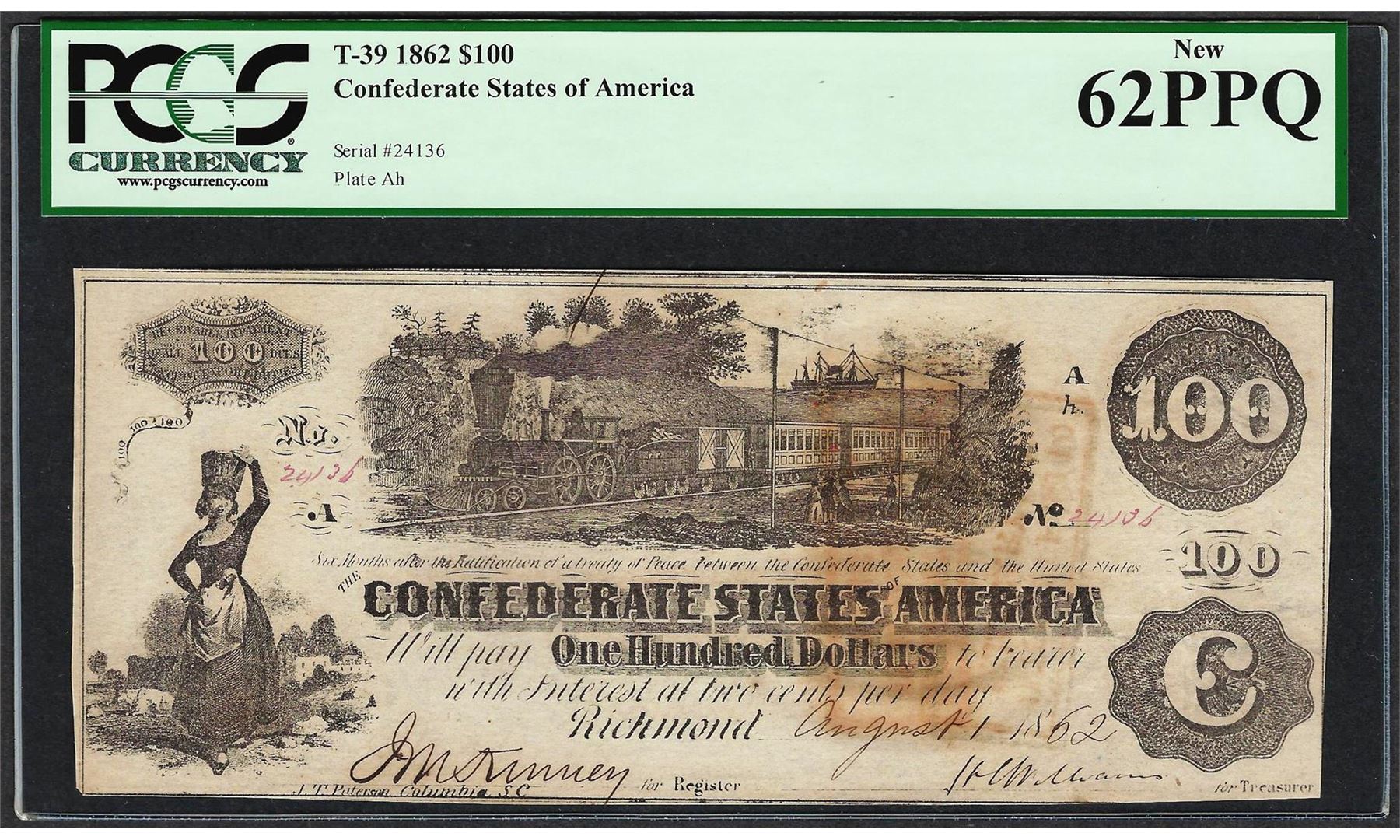 1862 $100 Confederate States of America Note T-39 PCGS New 62PPQ