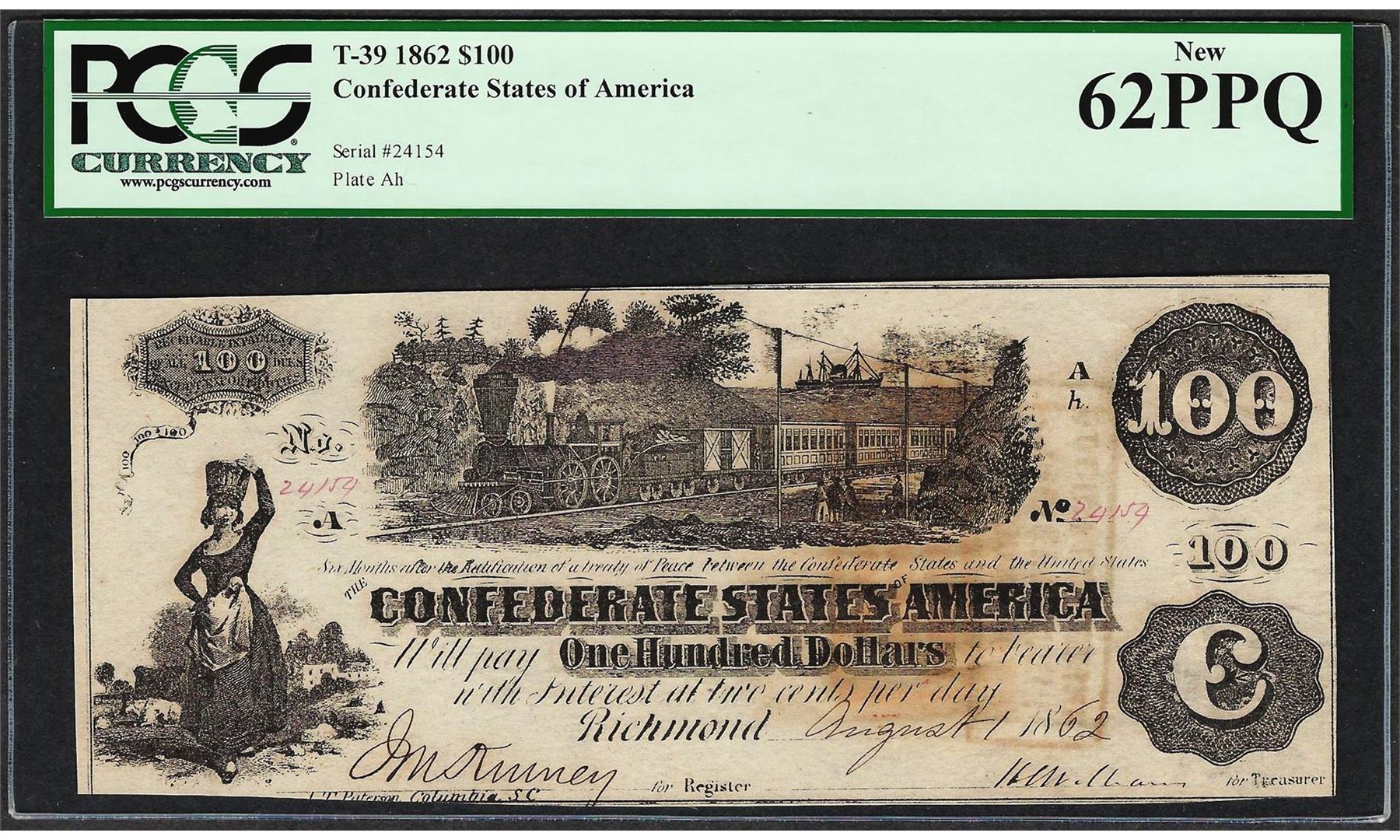 1862 $100 Confederate States of America Note T-39 PCGS New 62PPQ