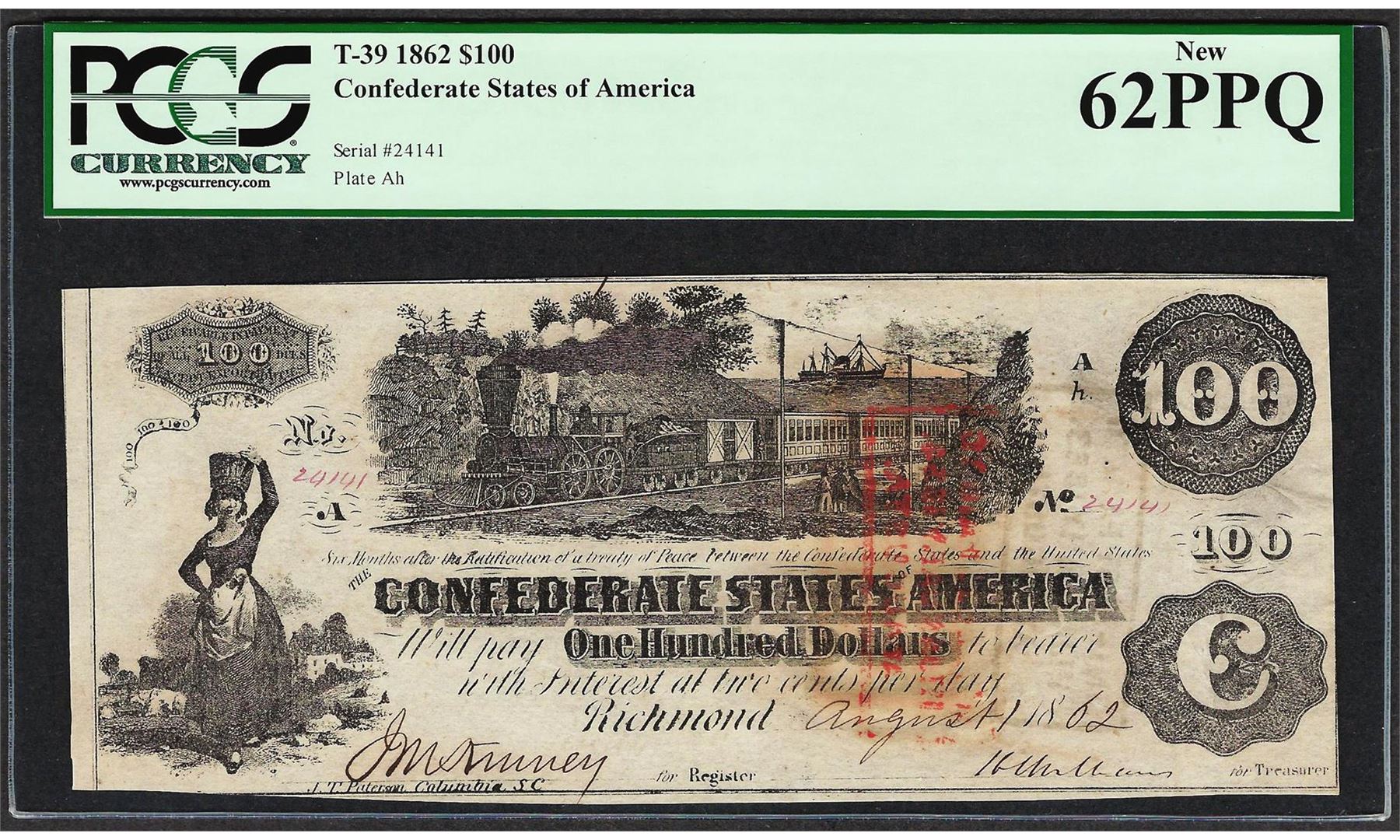 1862 $100 Confederate States of America Note T-39 PCGS New 62PPQ