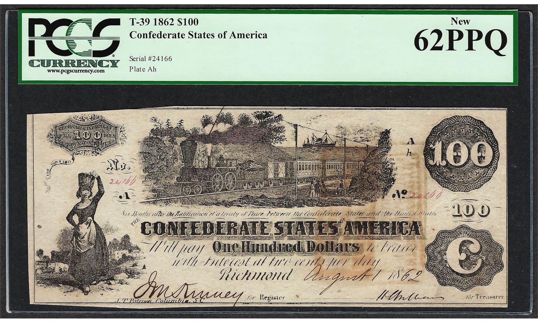 1862 $100 Confederate States of America Note T-39 PCGS New 62PPQ