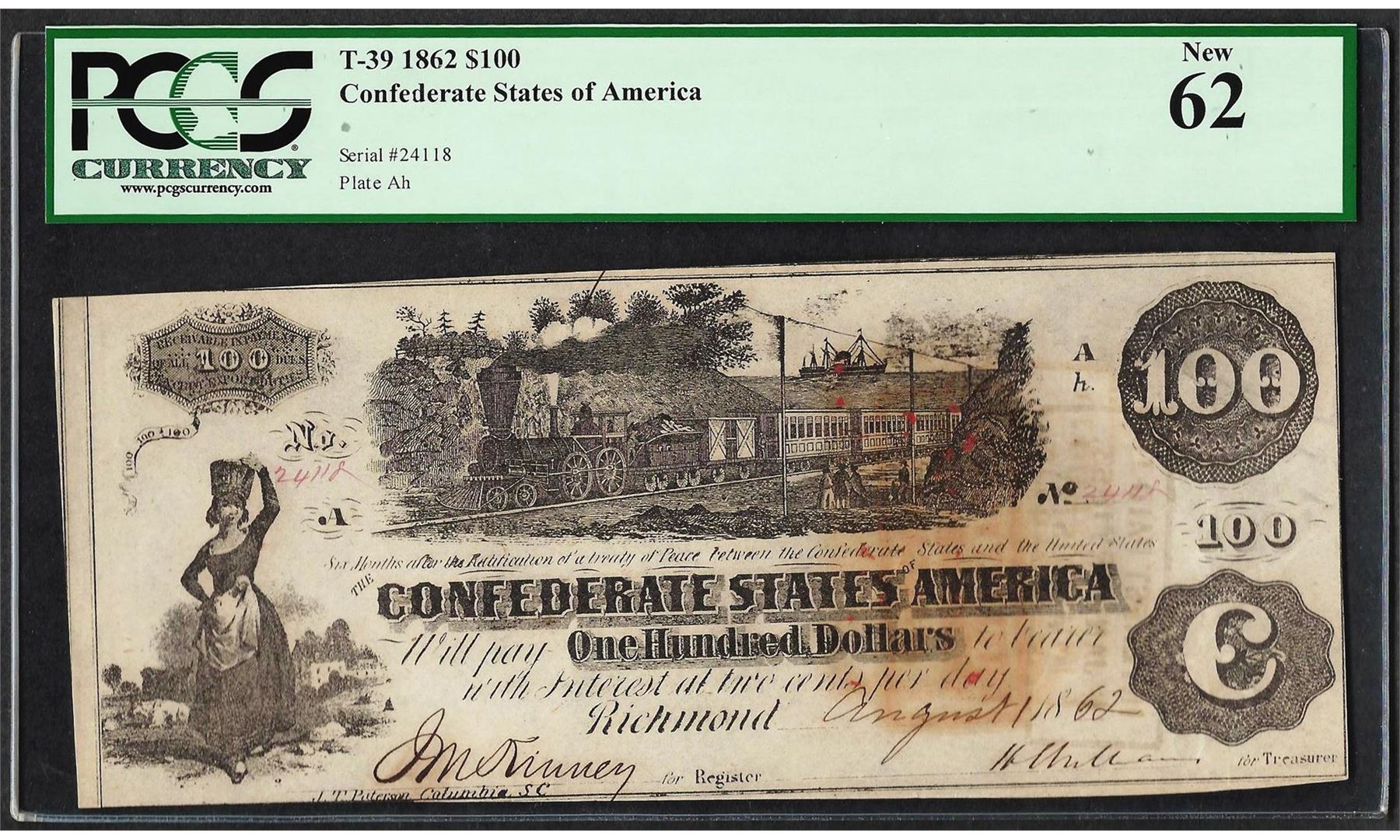 One 1862 $100 Confederate States of America Note T-39 PCGS New 62. PCGS Graded.