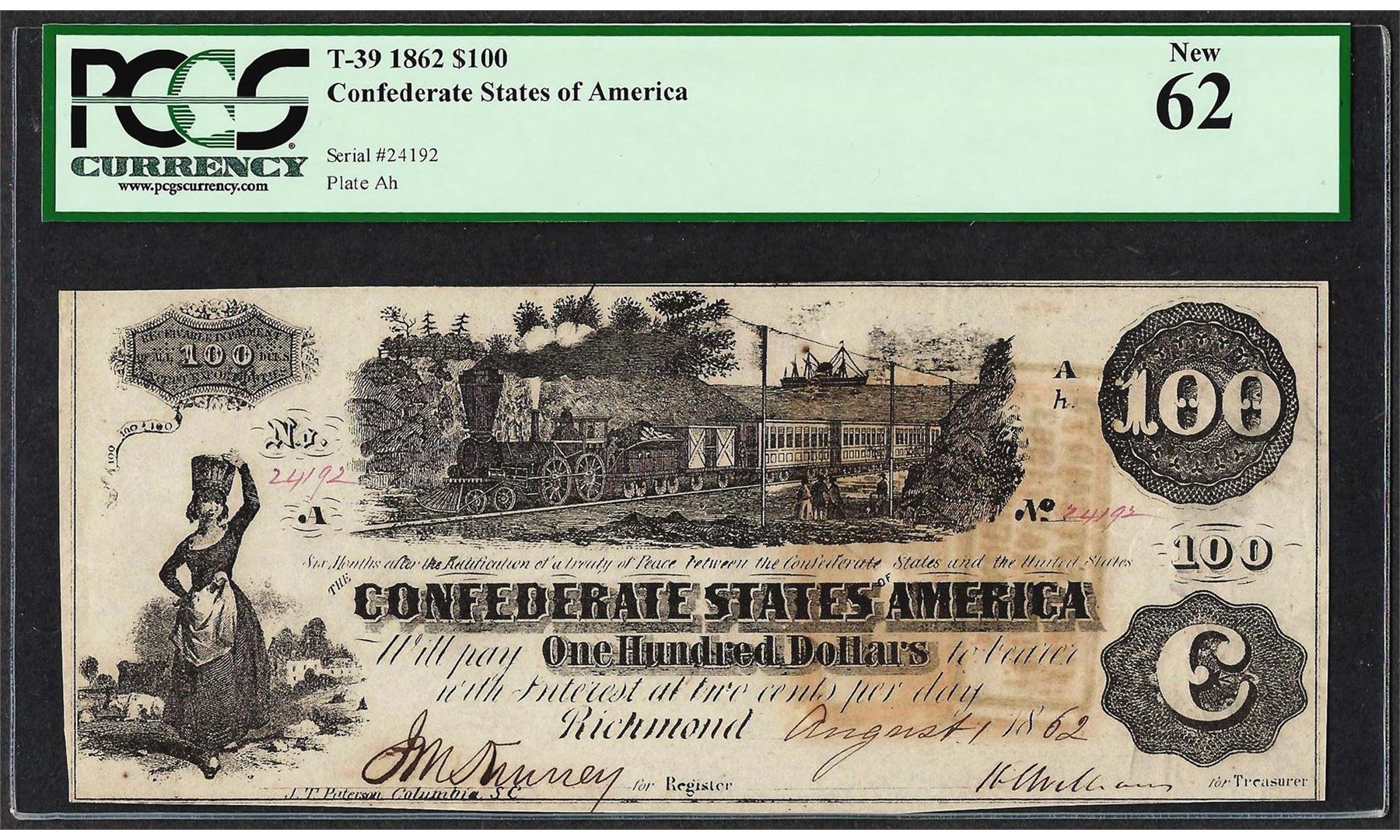 One 1862 $100 Confederate States of America Note T-39 PCGS New 62. PCGS Graded.