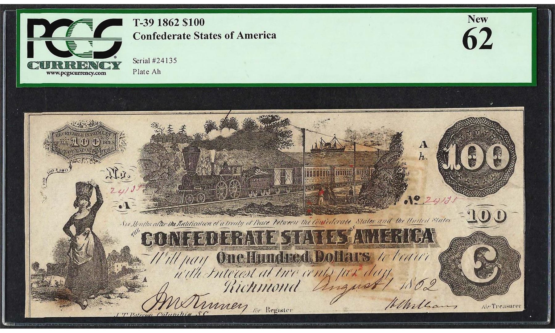 One 1862 $100 Confederate States of America Note T-39 PCGS New 62. PCGS Certified.