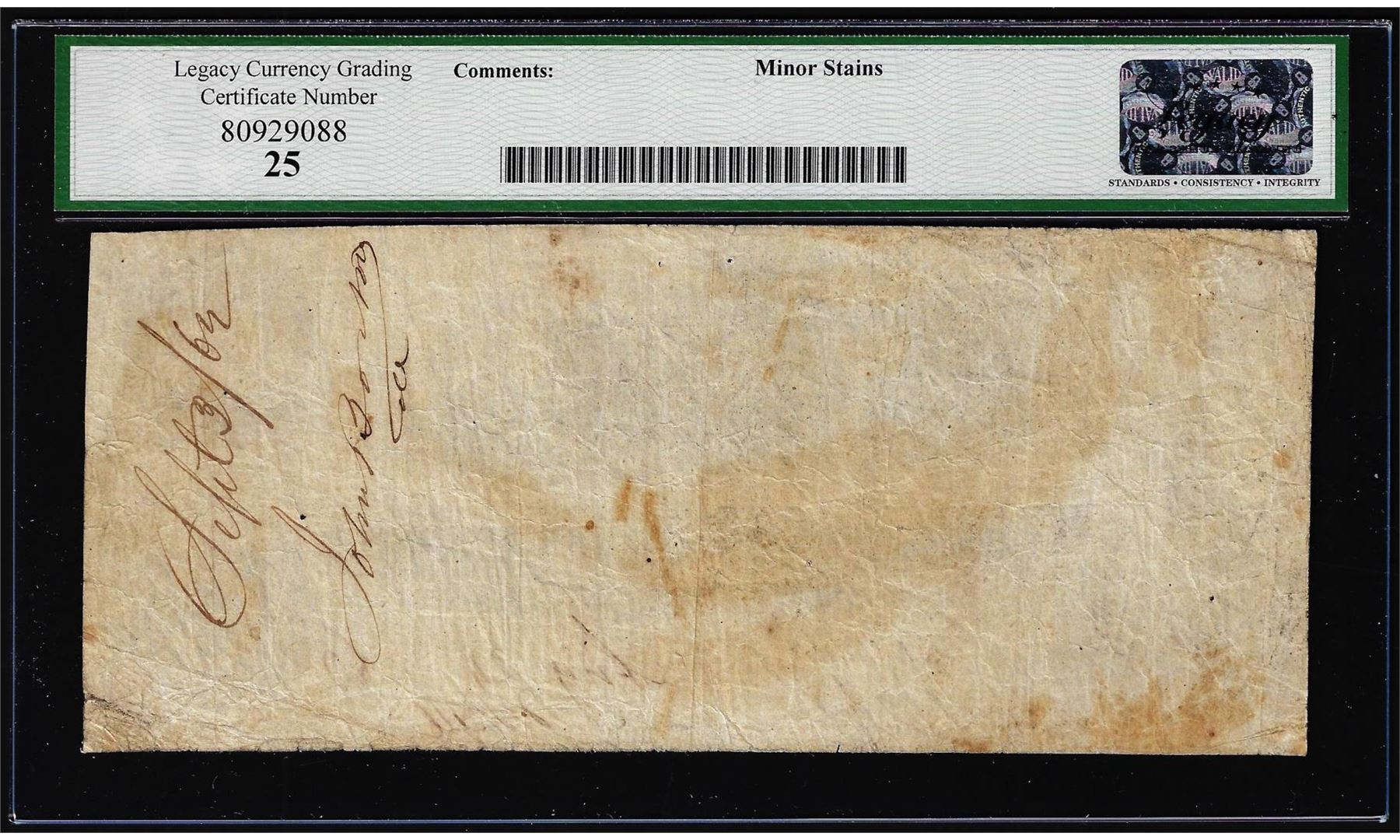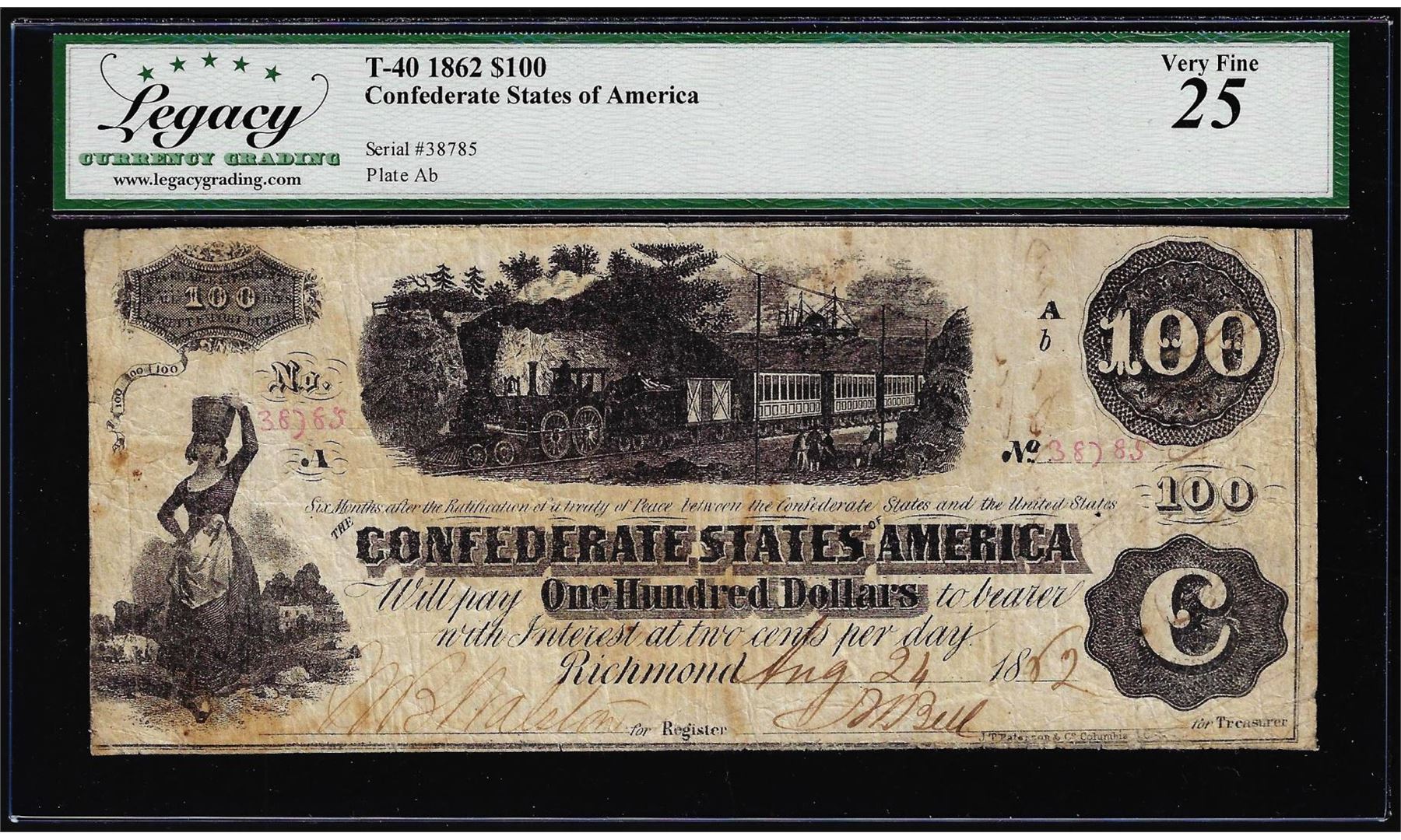 One 1862 $100 Confederate States of America Note T-40 Legacy Very Fine 25. Legacy Graded.