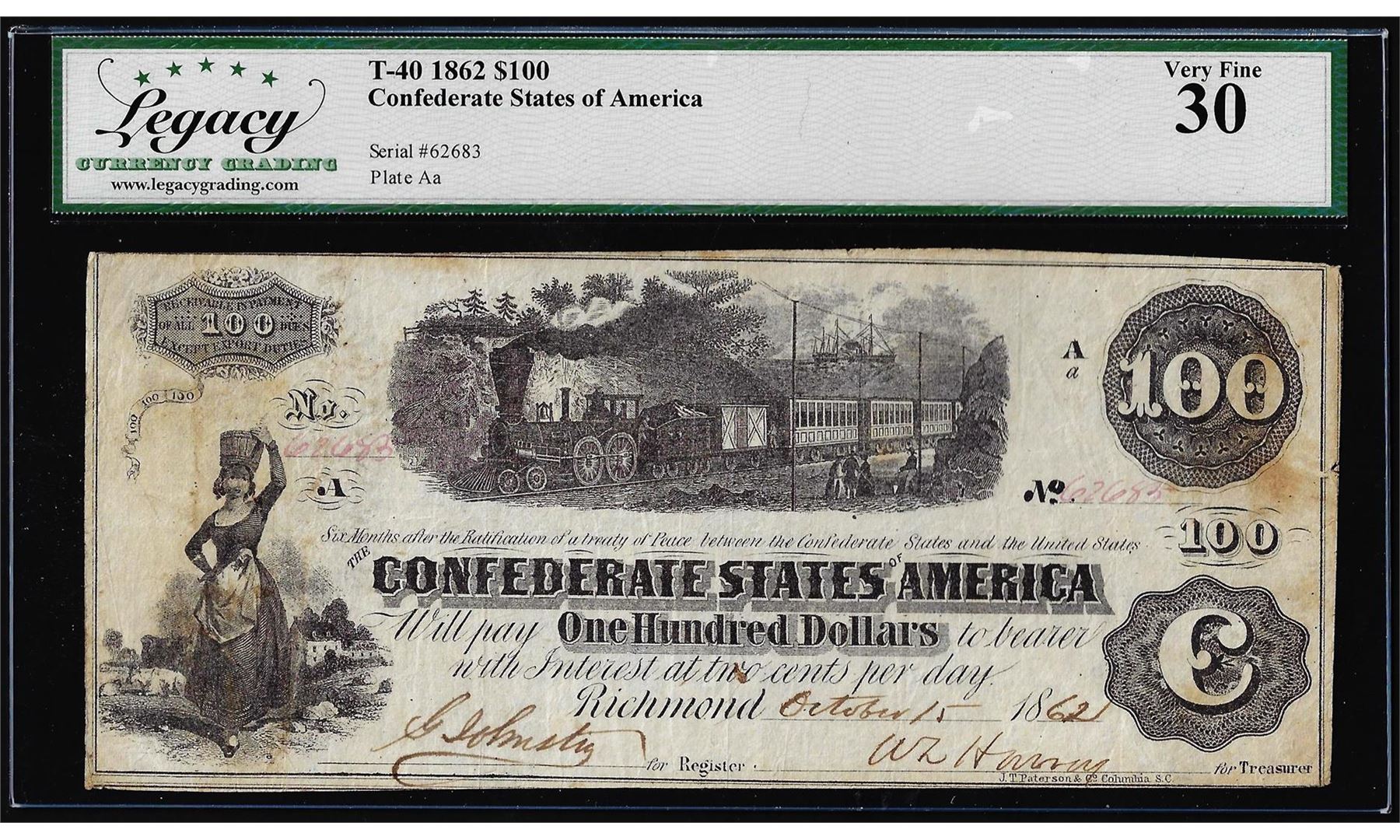 1862 $100 Confederate States of America Note T-40 Legacy Very Fine 30