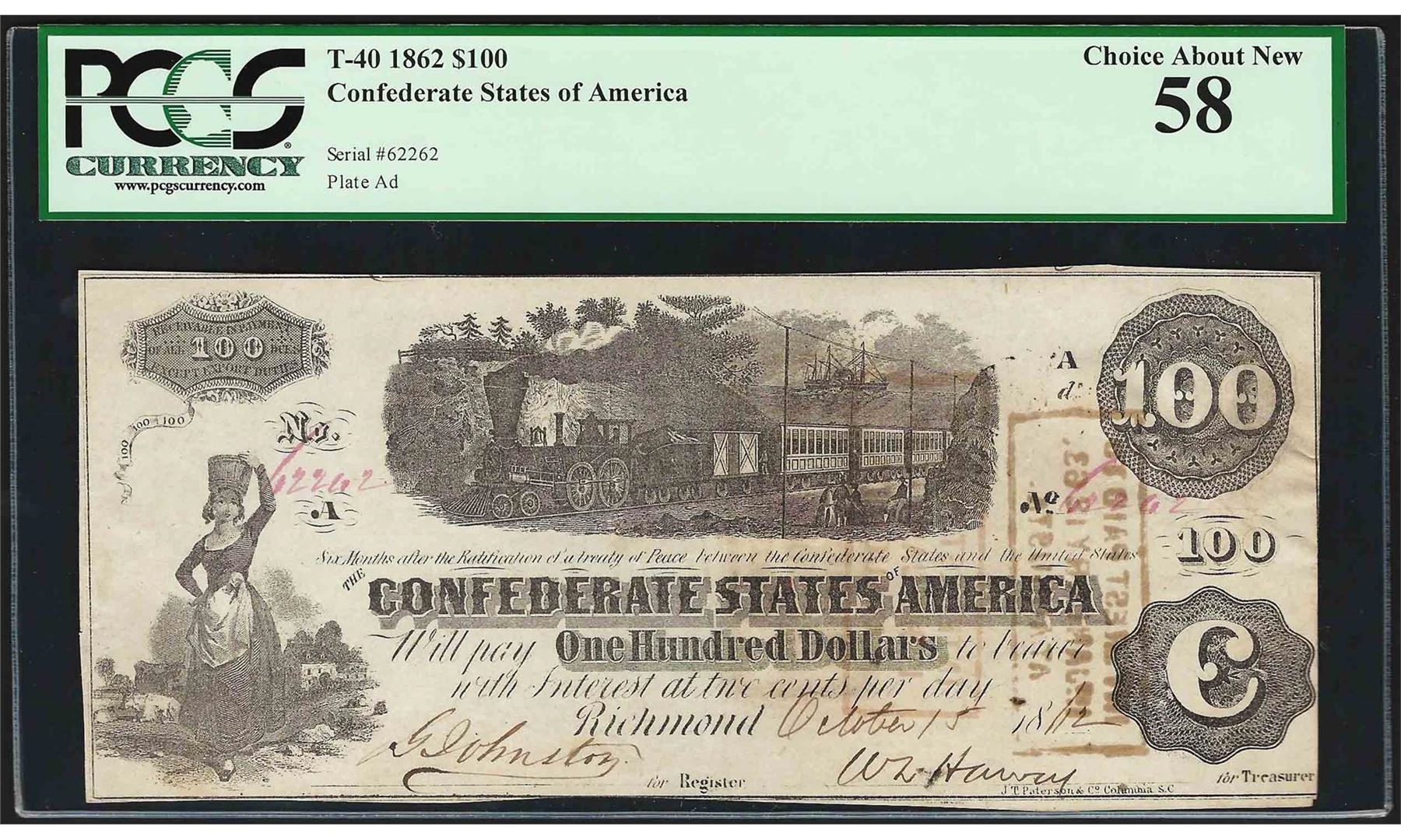 1862 $100 Confederate States of America Note T-40 PCGS Choice About New 58