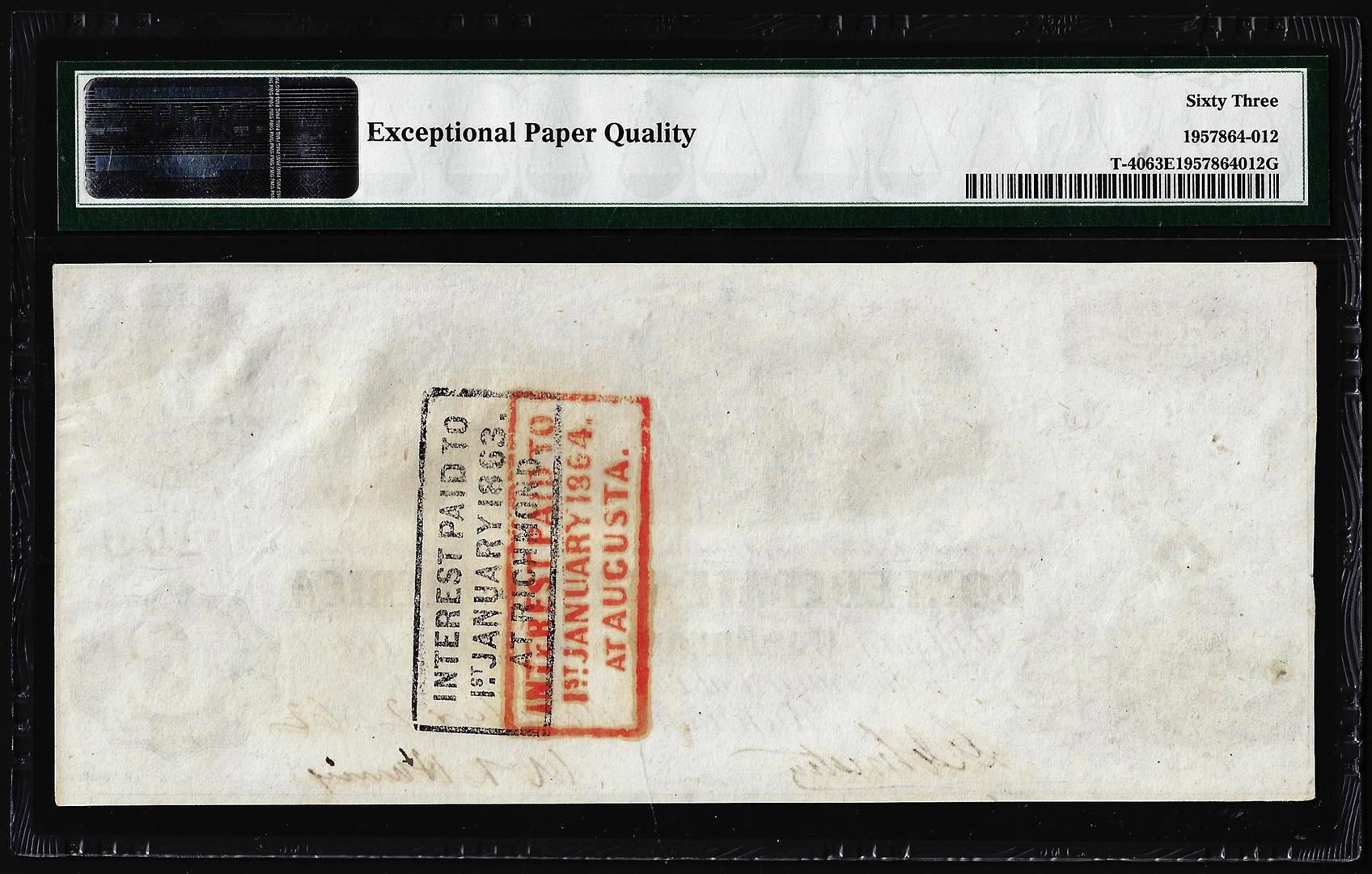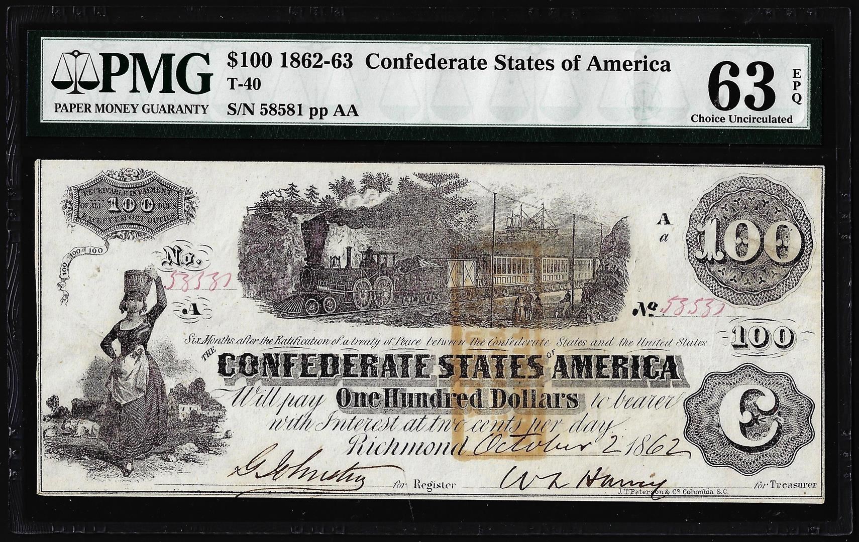 1862 $100 Confederate States of America Note T-40 PMG Choice Uncirculated 63EPQ