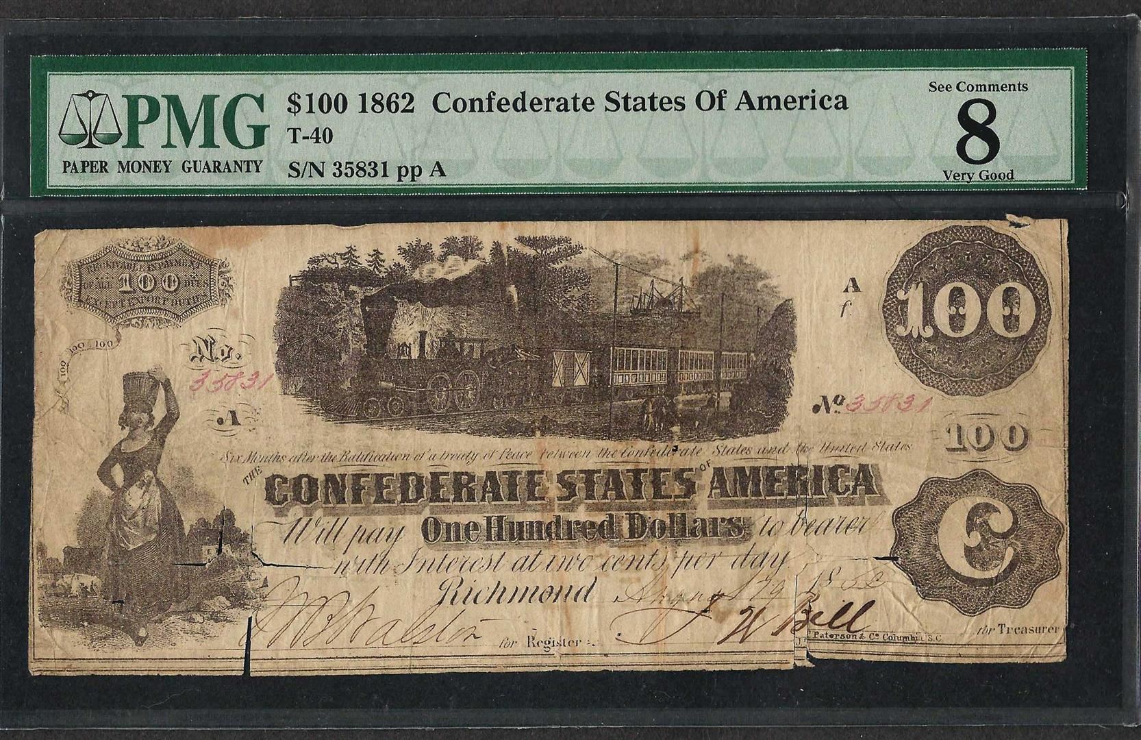 1862 $100 Confederate States of America Note T-40 PMG Very Good 8 Canceled