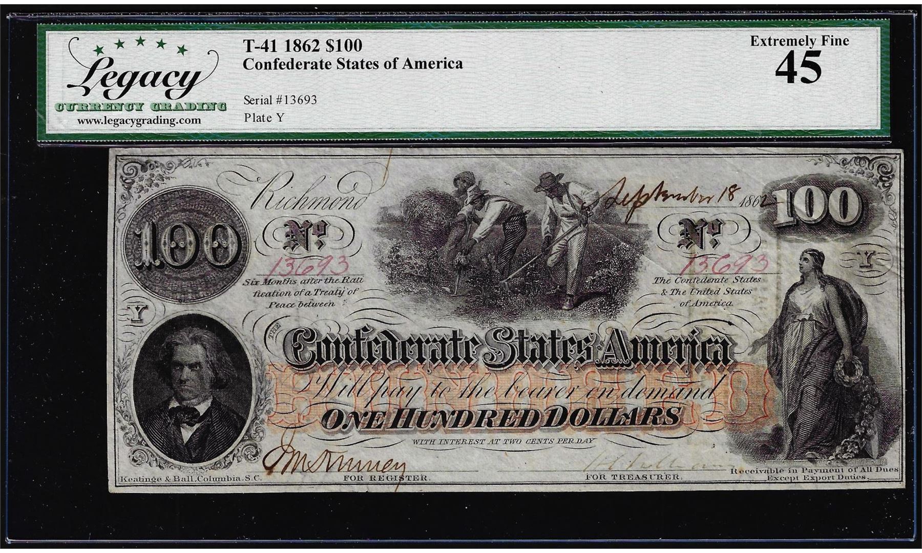 1862 $100 Confederate States of America Note T-41 Legacy Extremely Fine 45