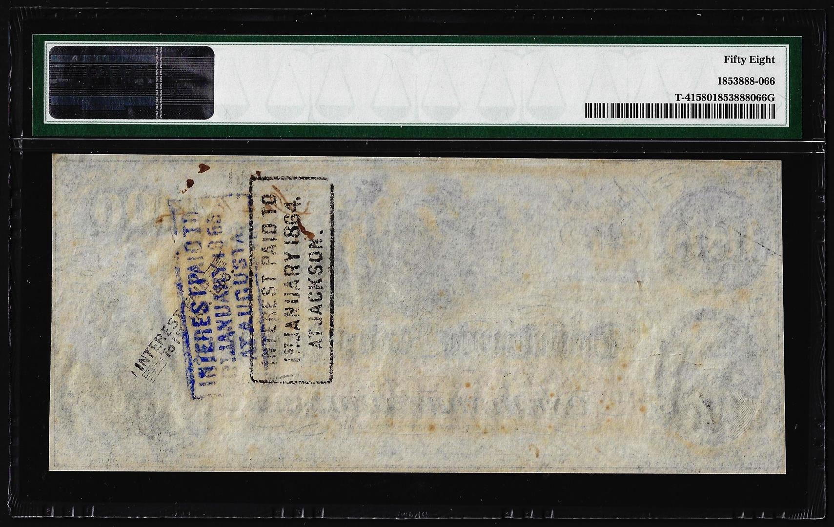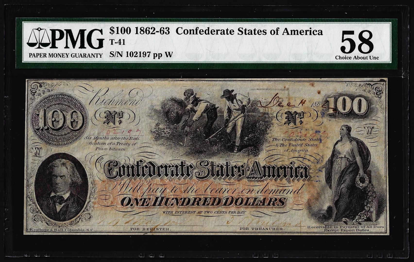 One 1862 $100 Confederate States of America Note T-41 PMG Choice About Uncirculated 58. PMG Certified.