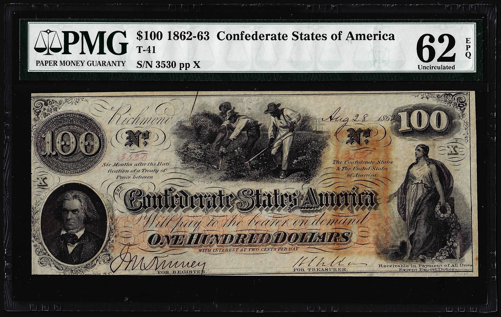 1862 $100 Confederate States of America Note T-41 PMG Choice Uncirculated 62EPQ