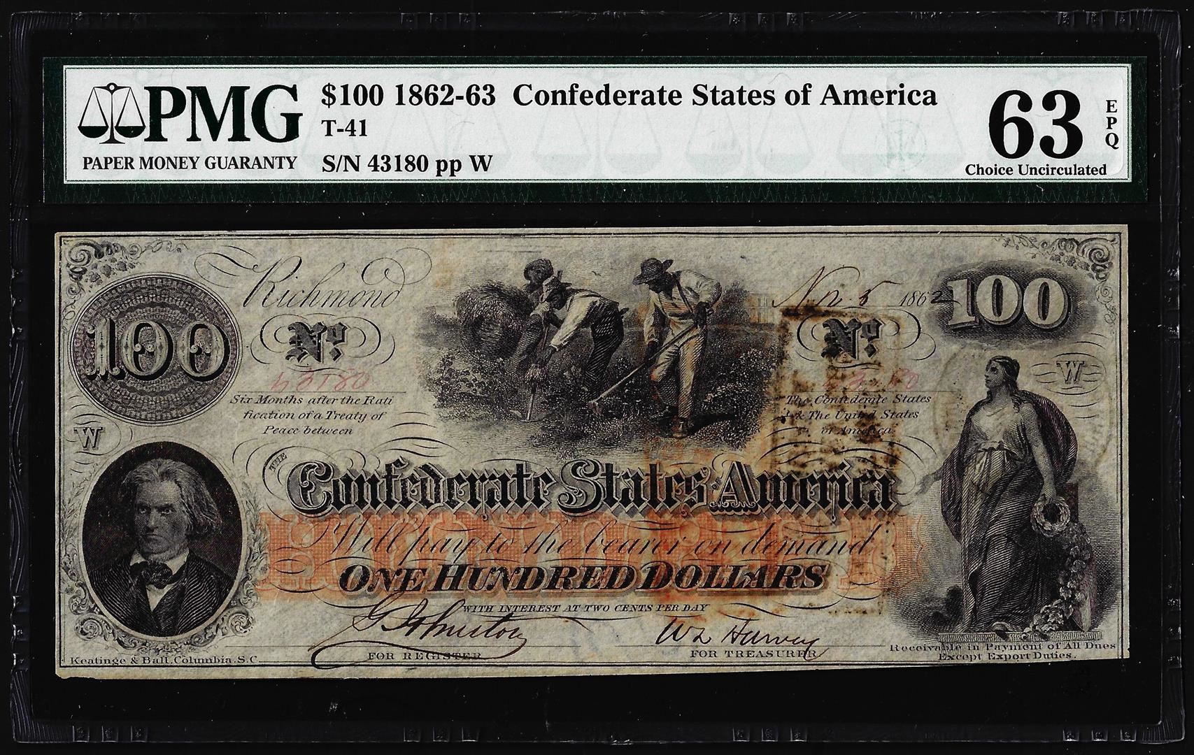 1862 $100 Confederate States of America Note T-41 PMG Choice Uncirculated 63EPQ
