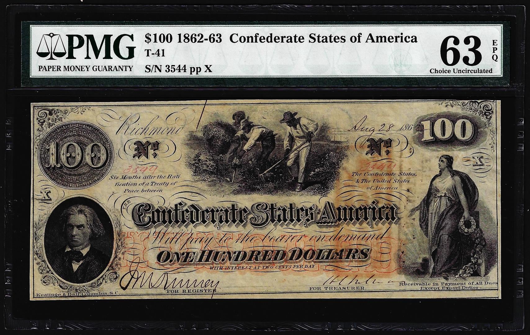 1862 $100 Confederate States of America Note T-41 PMG Choice Uncirculated 63EPQ