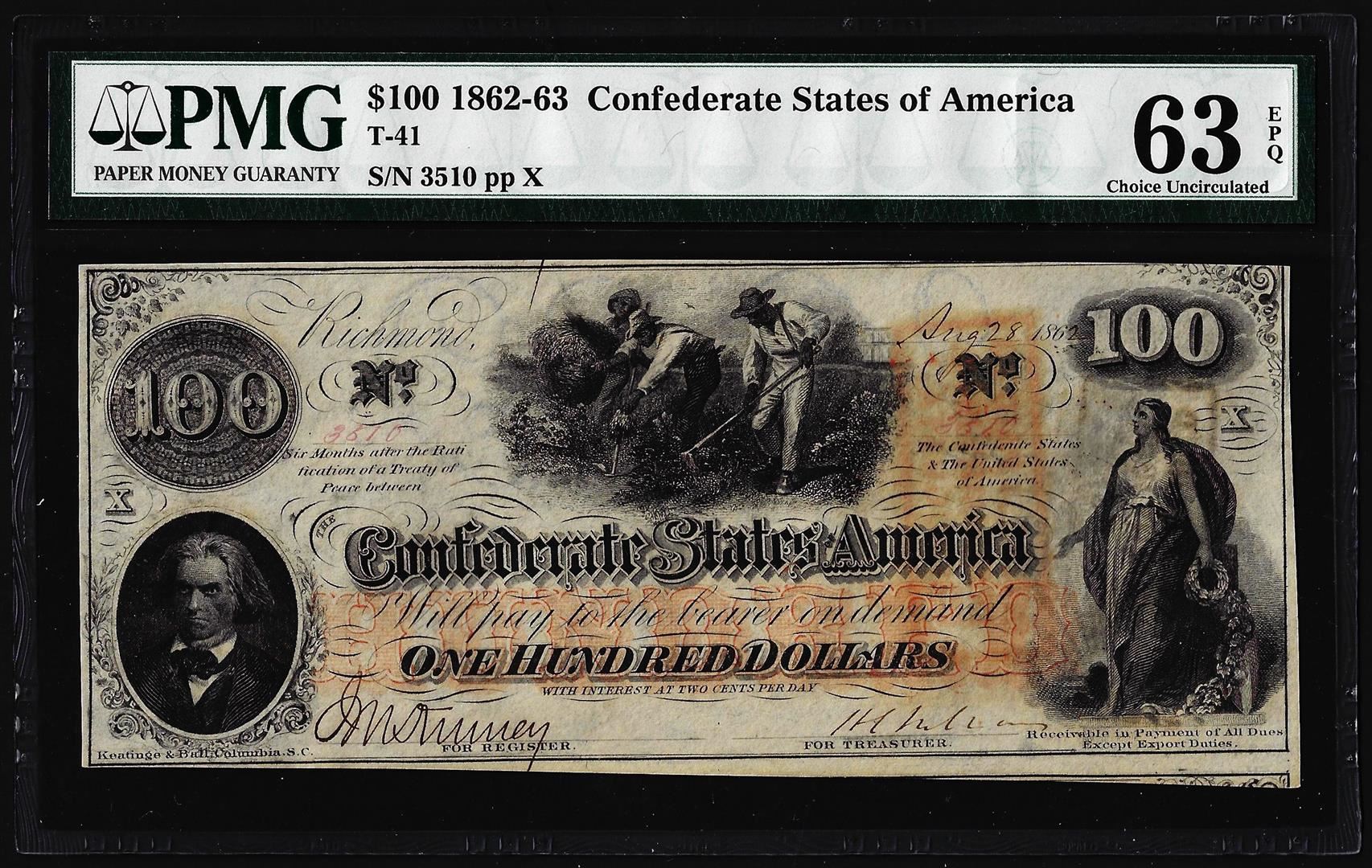 1862 $100 Confederate States of America Note T-41 PMG Choice Uncirculated 63EPQ