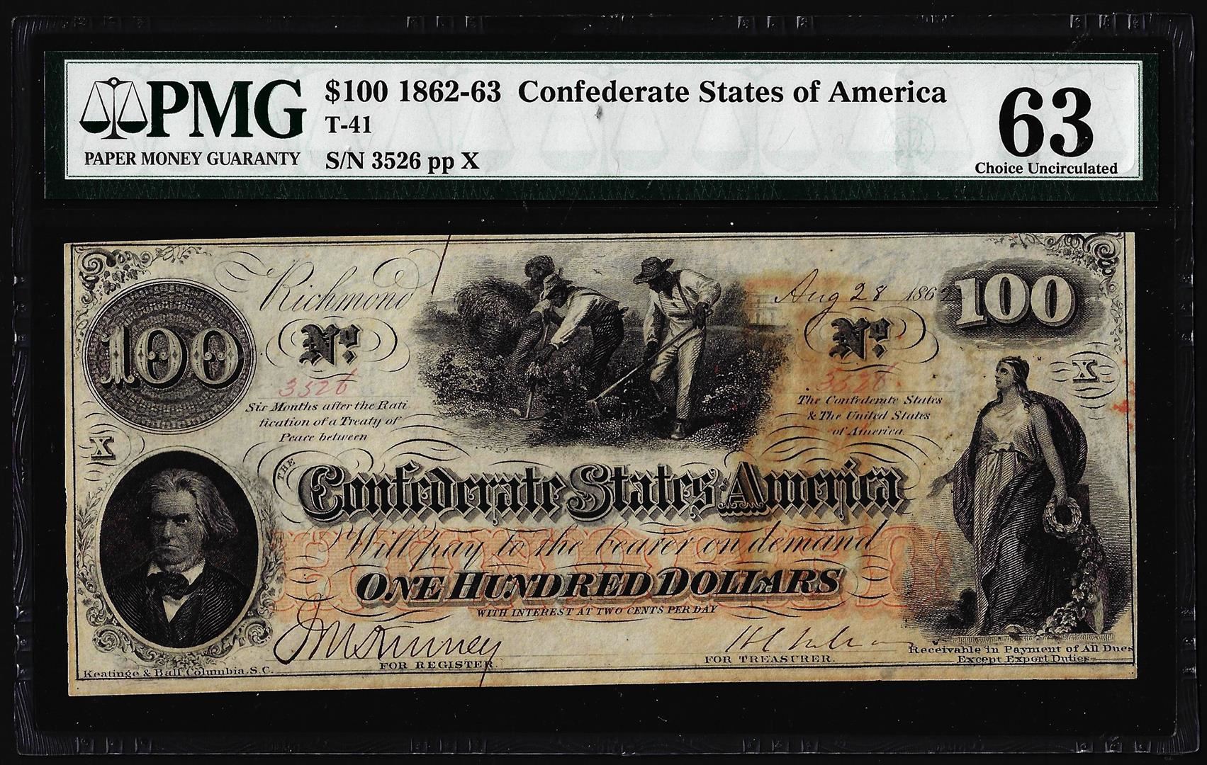 One 1862 $100 Confederate States of America Note T-41 PMG Choice Uncirculated 63. PMG Certified.