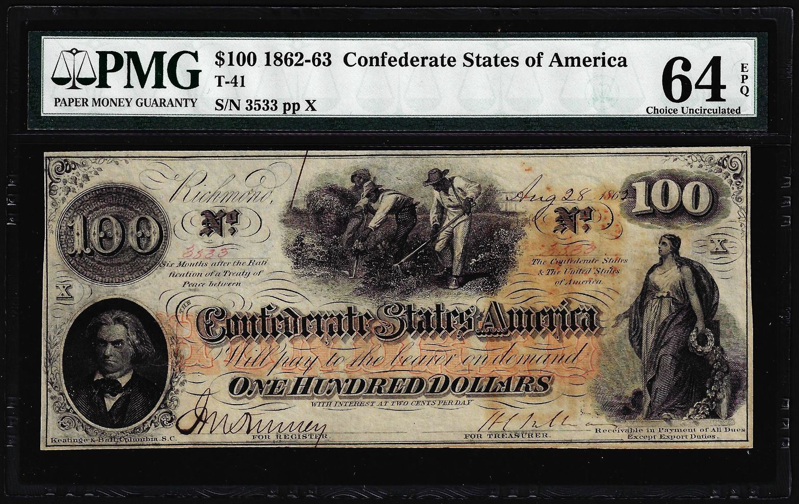 One 1862 $100 Confederate States of America Note T-41 PMG Choice Uncirculated 64EPQ.