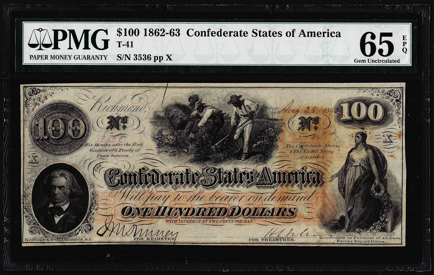 1862 $100 Confederate States of America Note T-41 PMG Gem Uncirculated 65EPQ