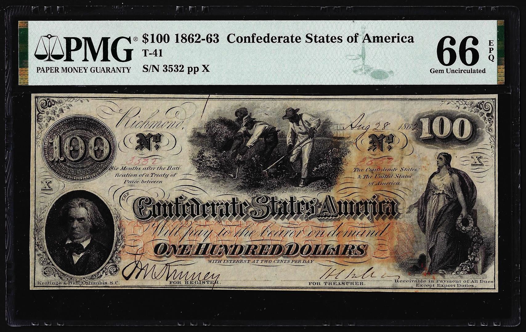 One 1862 $100 Confederate States of America Note T-41 PMG Gem Uncirculated 66EPQ. PMG Certified.