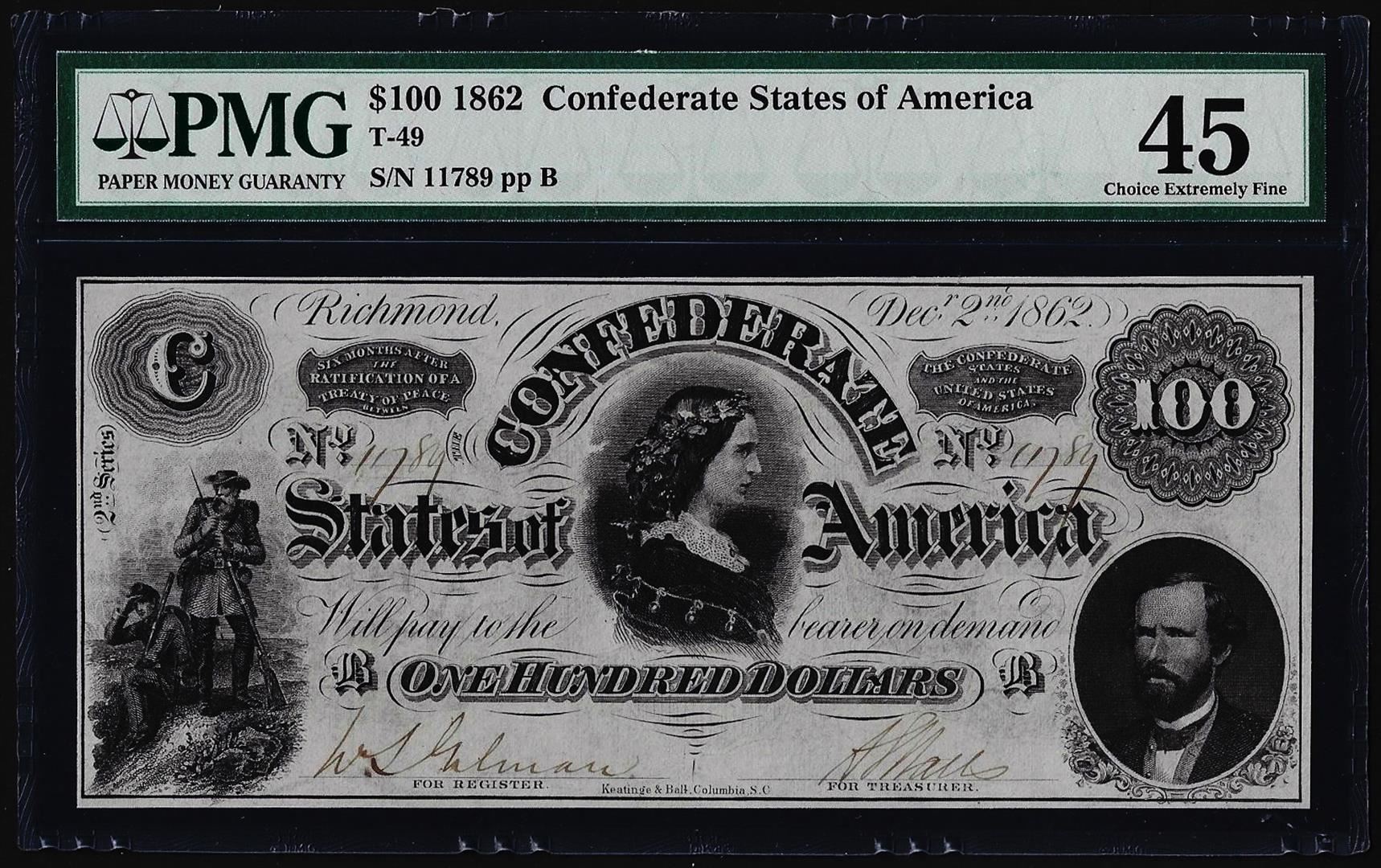 One 1862 $100 Confederate States of America Note T-49 PMG Choice Extremely Fine 45. PMG Certified.
