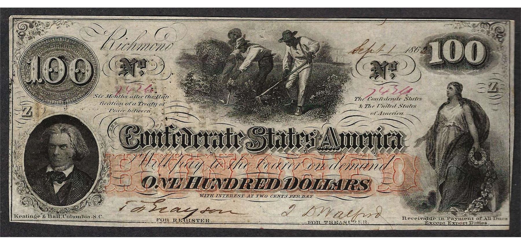 One 1862 $100 Confederate States of America Note.