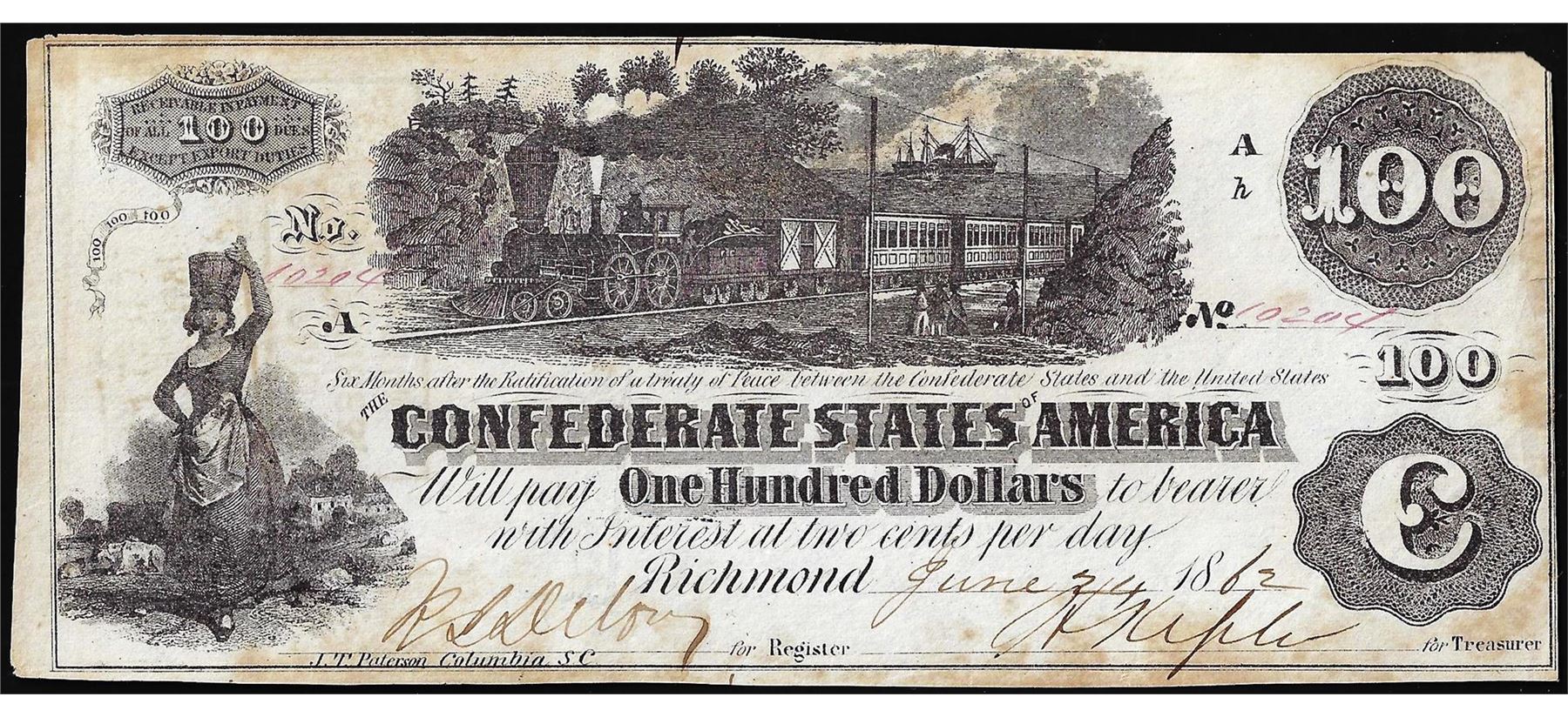One 1862 $100 Confederate States of America Note.