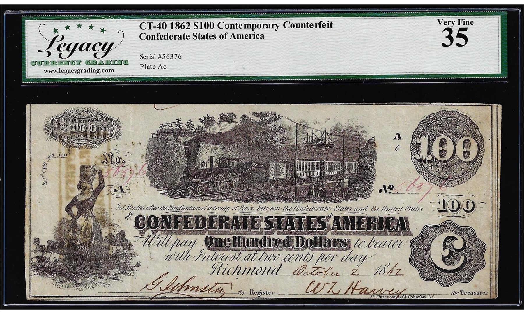 One 1862 $100 Contemporary Counterfeit Confederate States Note CT-40 Legacy Very Fine 35. Legacy Graded.