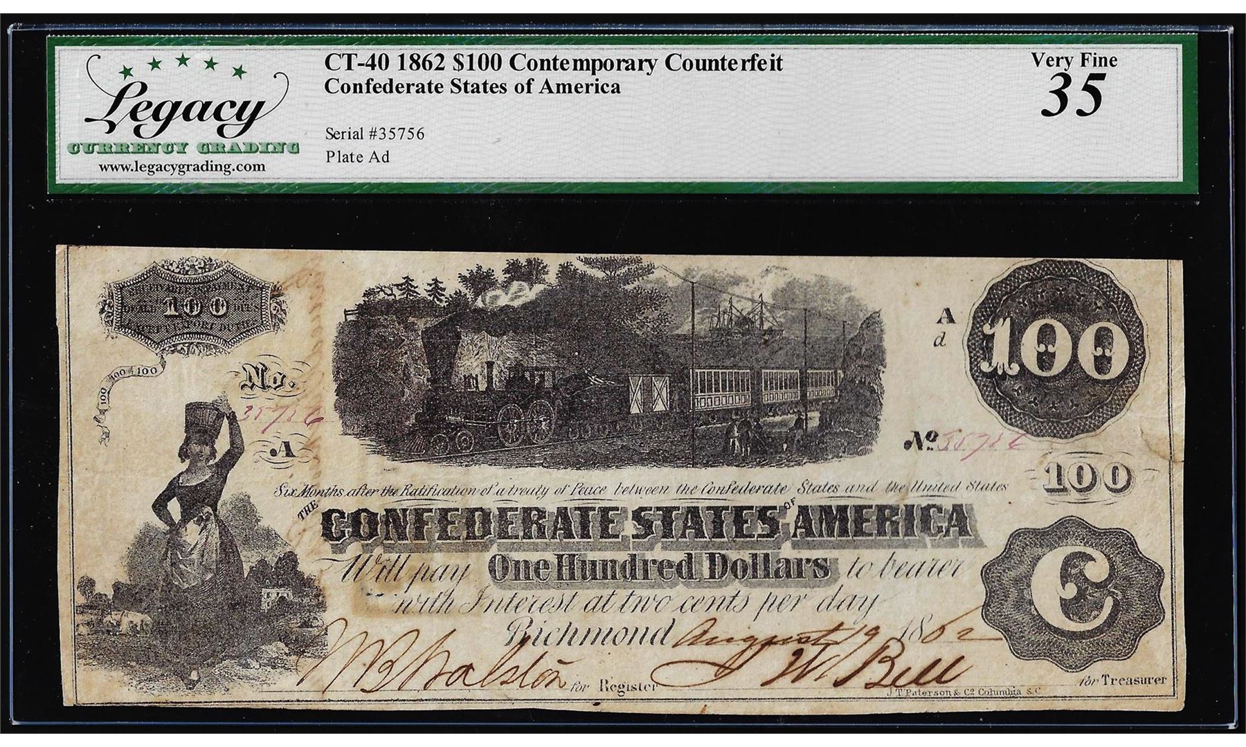 One 1862 $100 Contemporary Counterfeit Confederate States Note CT-40 Legacy Very Fine 35. Legacy Graded.