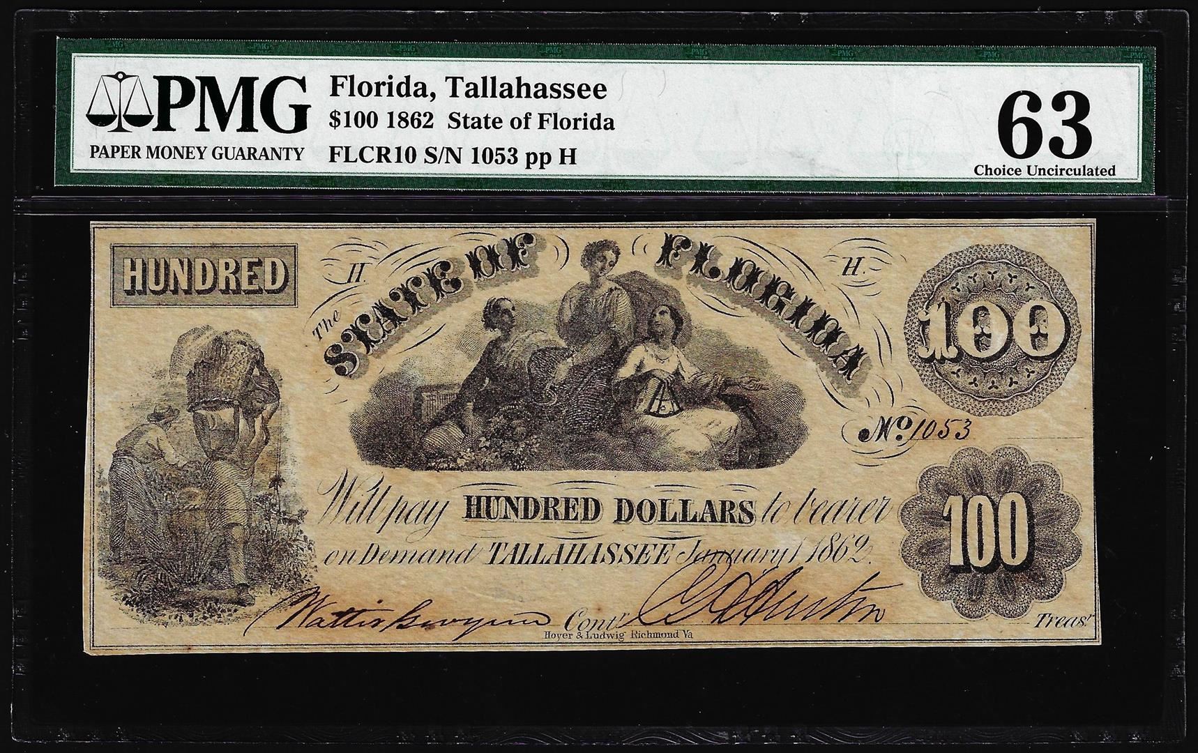 One 1862 $100 State of Florida Tallahassee Cr.10 Obsolete Note PMG Ch. Uncirculated 63. PMG Certified.