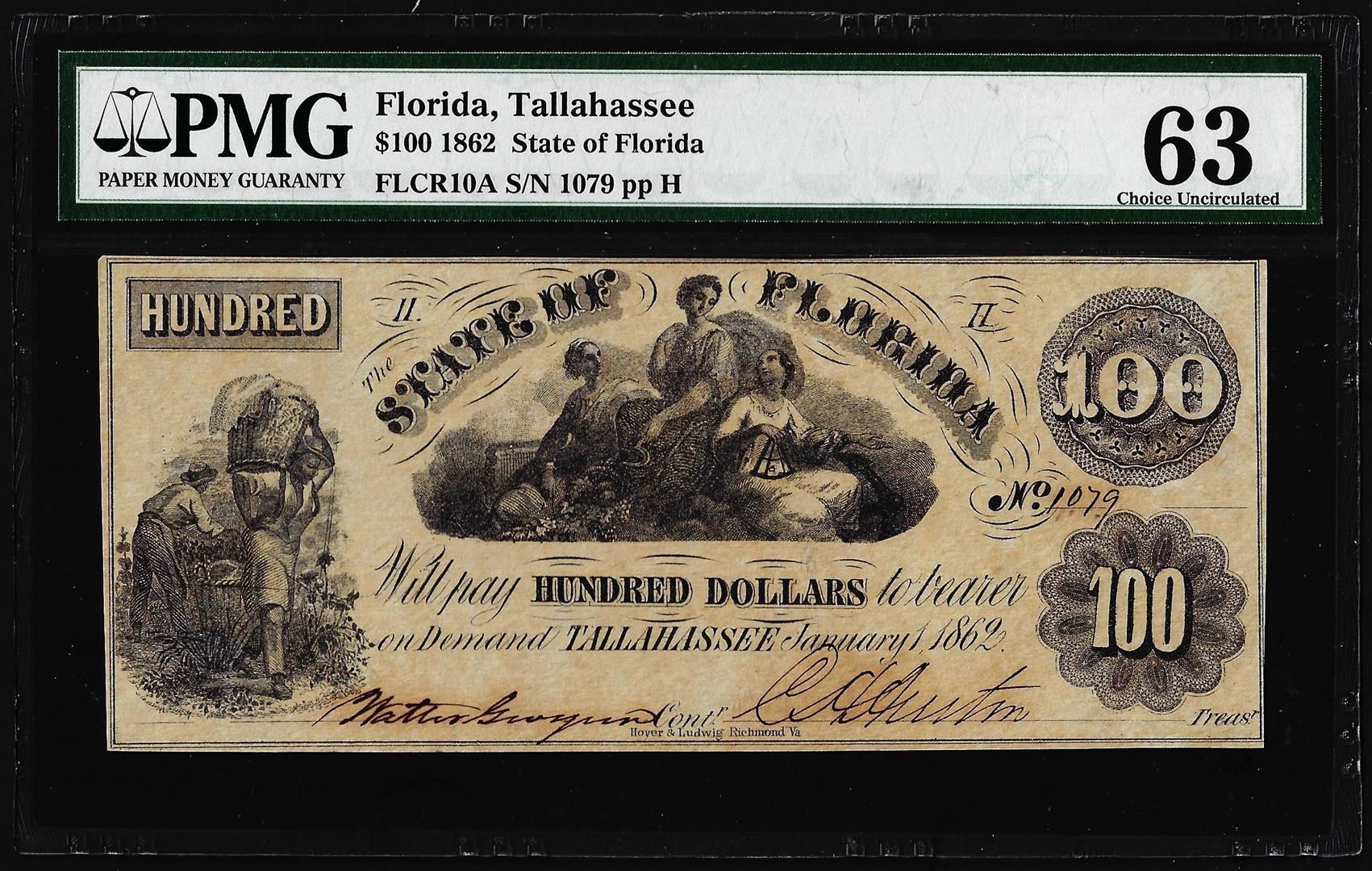 One 1862 $100 State of Florida Tallahassee Cr.10A Obsolete Note PMG Ch. Uncirculated 63. PMG Certified.